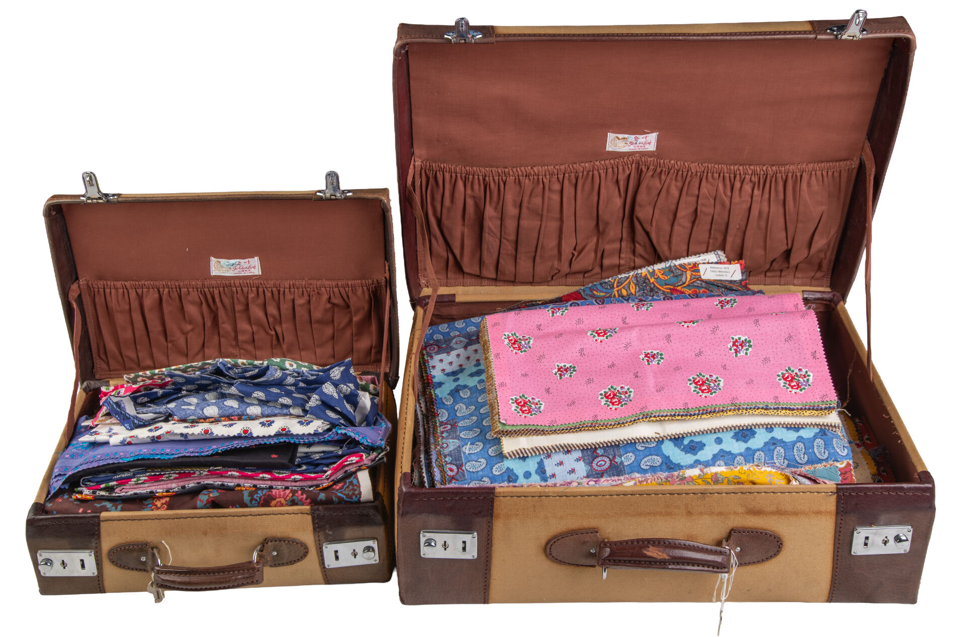 Souleiado et Charles Demery. Environ deux cents carrés (40 x 40 cm ou 40 x 33 cm). On y joint des coupes diverses avec leur valise en coton, vers 1970 (60 x 60 , 60 x 160, 3 x 130, 85 x 150, 1 x 130... etc). Tissus d'ameublement pour tapissier décorateur provenant du stock de magasin "Maison Lechevallier - Meubles Tapissier Décorateur à Saint-Lô" qui vendait les éditeurs en tissus français : Pierre FREY, CHOTARD, LELIEVRE, URGE, ROMANEX...