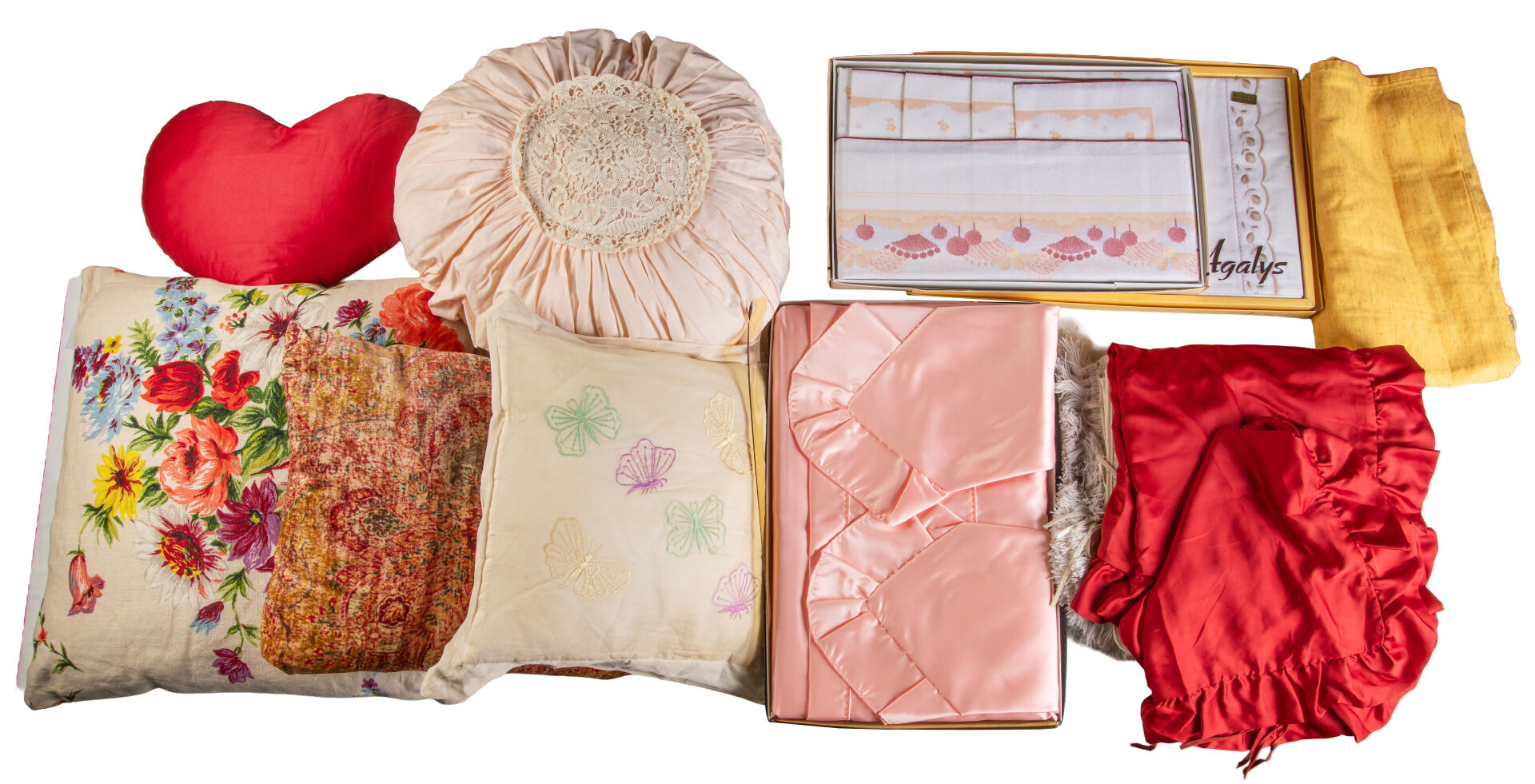 Le Lièvre Paris. Dessus de lit en coton et polyester comprenant : - Courtepointe 220 x 160 cm - Deux housses portefeuilles 62 x 37 cm - Quatre coussins 40 x 40 cm On y joint : - Cinq coussins - Parure de lit en satin rose - Agalis, Drap et deux taies Agalis - La Maison d'Ariane, Nappe 150 x 220 cm et 8 sets de table - Six taies d'oreiller 65 x 65 cm Tissus d'ameublement pour tapissier décorateur provenant du stock de magasin "Maison Lechevallier - Meubles Tapissier Décorateur à Saint-Lô" qui vendait les éditeurs en tissus français : Pierre FREY, CHOTARD, LELIEVRE, URGE, ROMANEX...