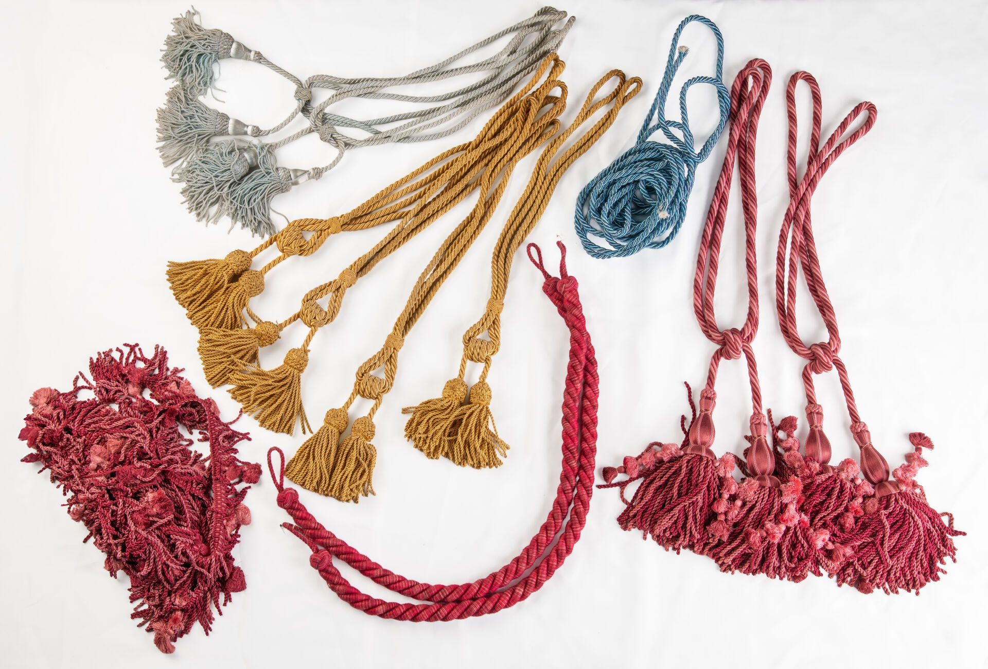 Lot de passementeries. Tissus d'ameublement pour tapissier décorateur provenant du stock de magasin "Maison Lechevallier - Meubles Tapissier Décorateur à Saint-Lô" qui vendait les éditeurs en tissus français : Pierre FREY, CHOTARD, LELIEVRE, URGE, ROMANEX...