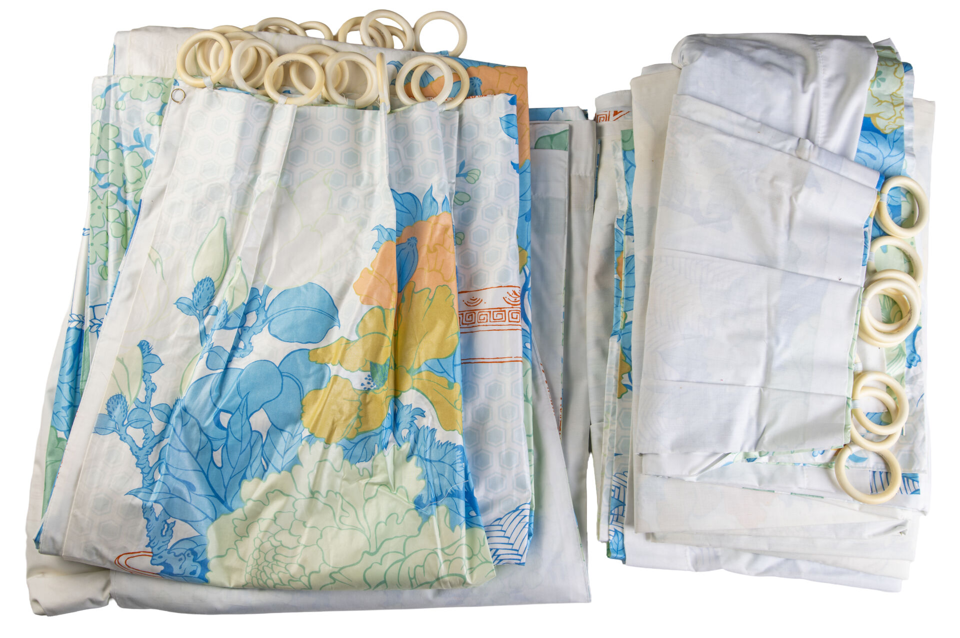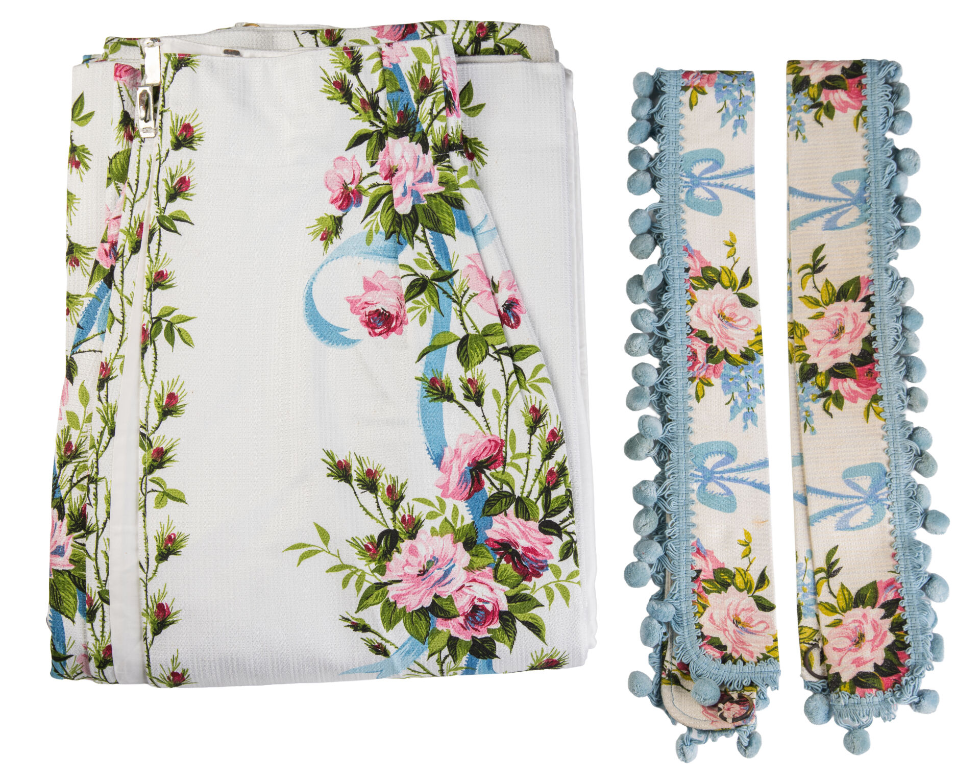 Lot de rideaux comprenant : - Paire de double rideaux fleuris à "pompons" avec deux embrasses ( H : 1,20 ; L : 1,20 m ) - Lot de quatre doubles rideaux et une paire de double rideaux avec deux embrasses à décor de semis de fleurs percales ( H : 2,10 m ; L : 1,30 m ) - Paire de double rideaux fleuris, vers 1960 ( H : 2, 50 m ; L : 1,20 m) et deux embrasses à pompons Tissus d'ameublement pour tapissier décorateur provenant du stock de magasin "Maison Lechevallier - Meubles Tapissier Décorateur à Saint-Lô" qui vendait les éditeurs en tissus français : Pierre FREY, CHOTARD, LELIEVRE, URGE, ROMANEX...