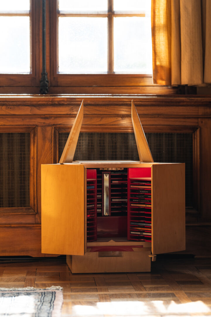 Michel BRIARD (1930-2025). Meuble HIFI en bois et placage de sycomore ouvrant à deux vantaux dissimulant des étagères range-CD et un tiroir secret et une tablette secrète. H : 69 cm ; L : 38 cm ; l : 36,5 cm