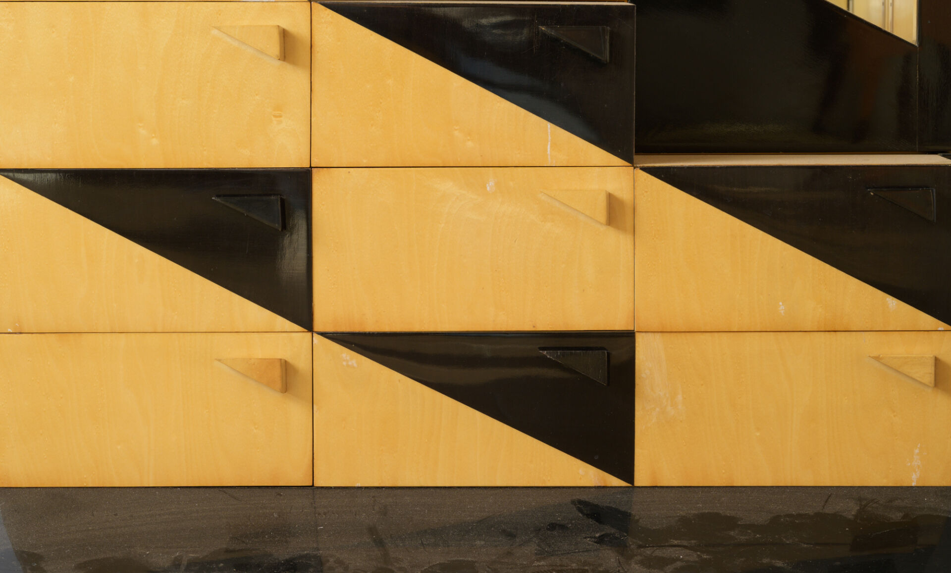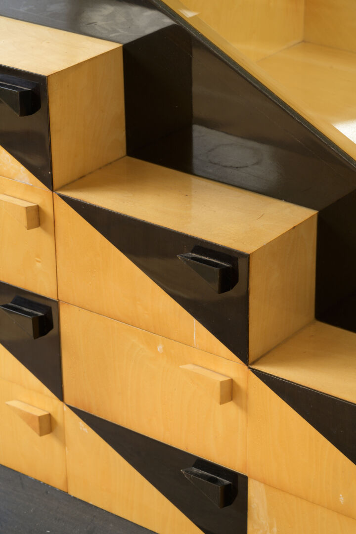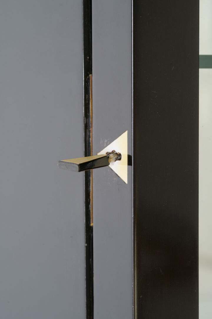 Michel BRIARD (1930-2025). Vitrine - cabinet en bois et placage de poirier noirci et sycomore blanchi avec quatre tablettes en verre, ouvrant à un vantail vitré en partie haute et neuf tiroirs en partie basse. H : 210 cm ; L : 93 cm ; l : 56 cm