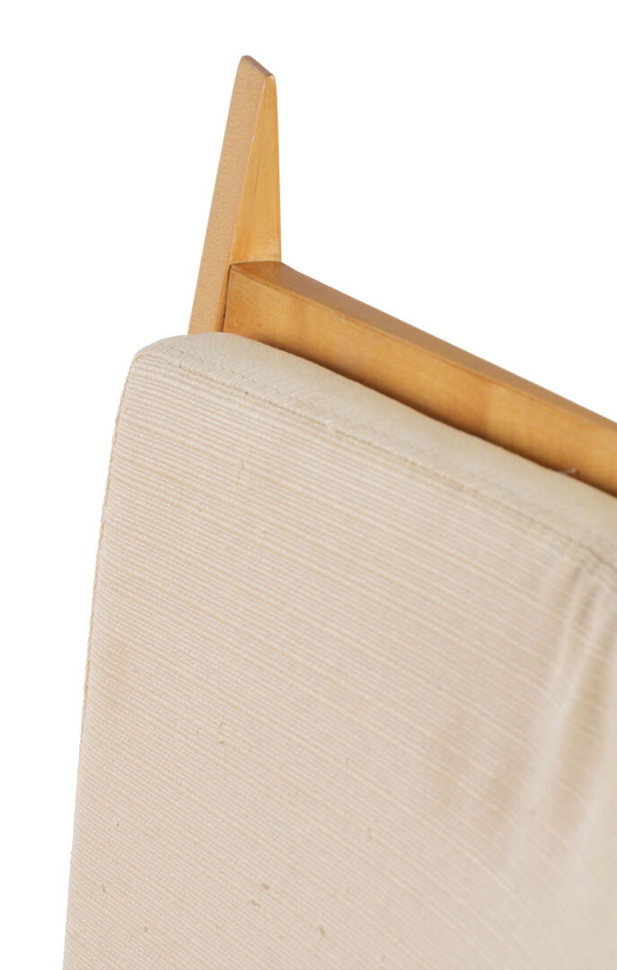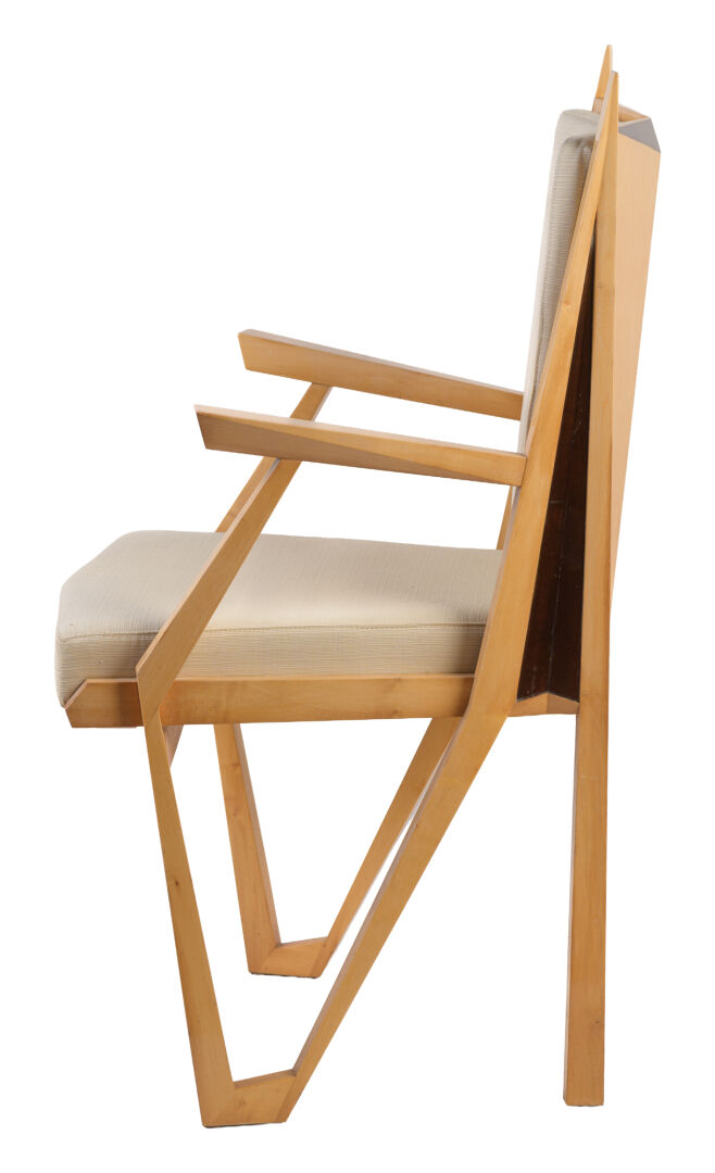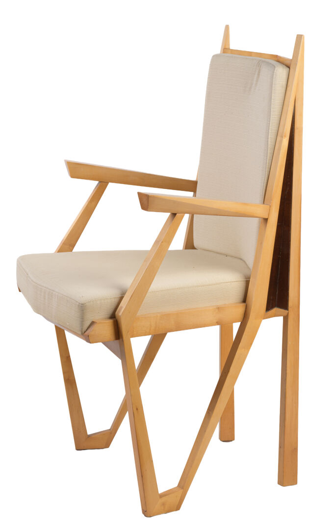 Michel BRIARD (1930-2025). Fauteuil en bois et placage de sycomore, assise en tissu beige. H : 98 cm ; L : 55 cm ; l : 57 cm