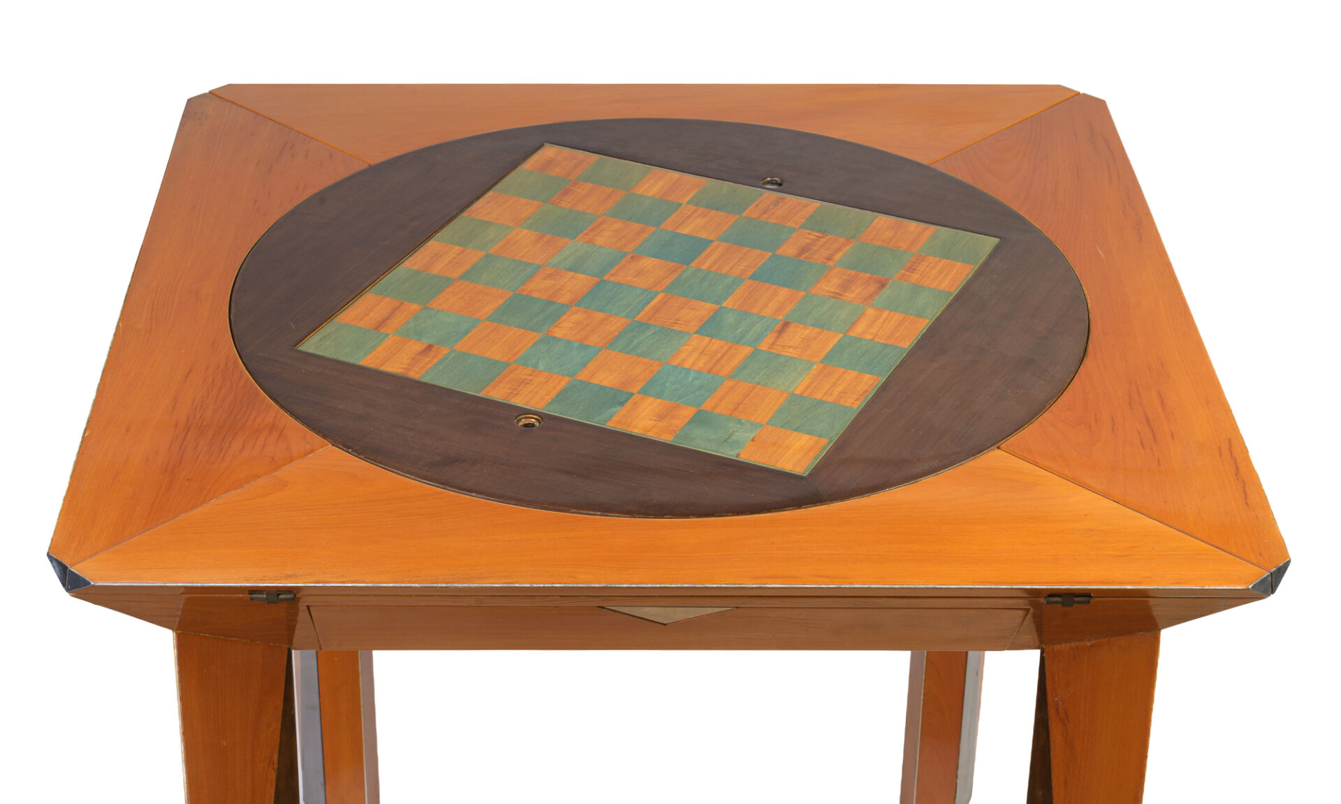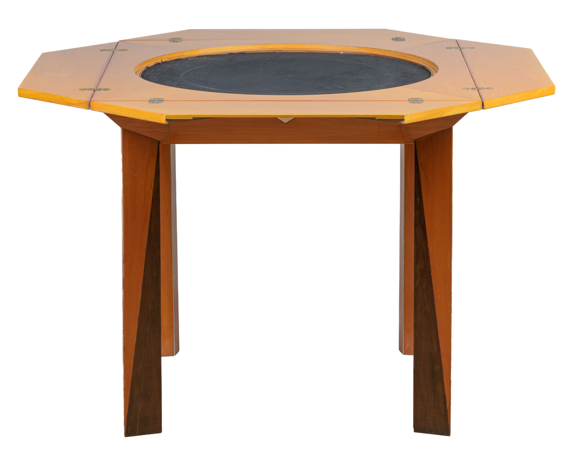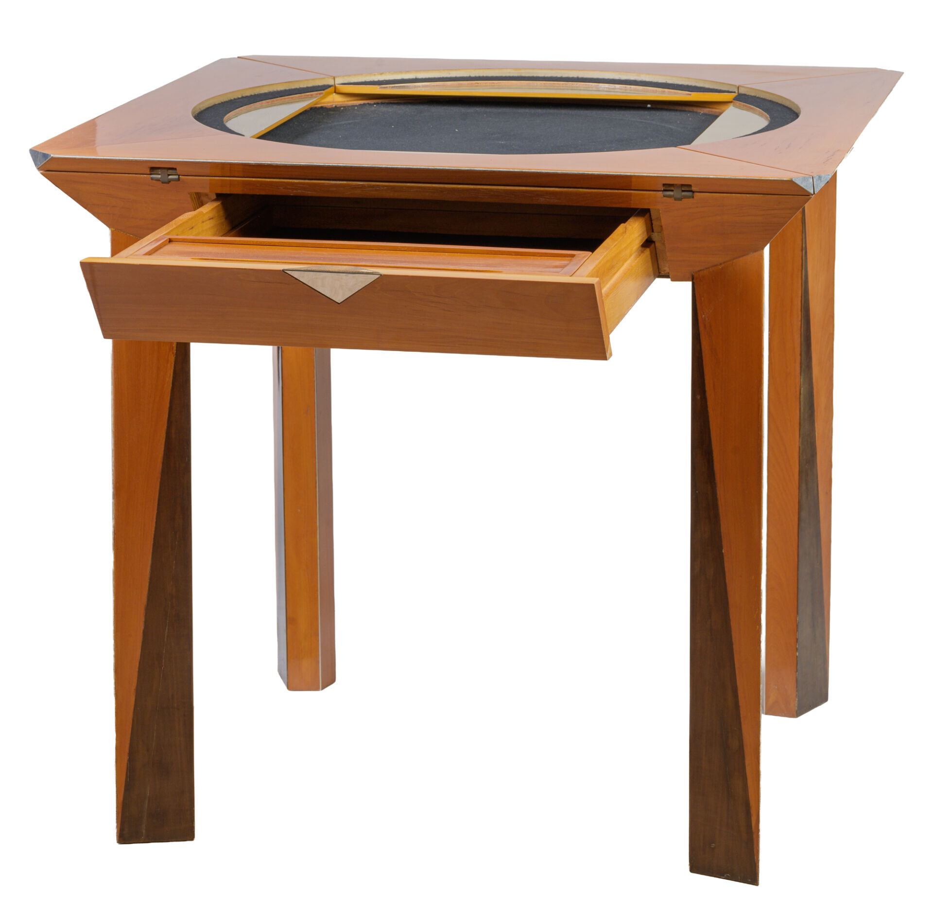 Michel BRIARD (1930-2025). Table à jeux en bois, placage et marqueterie de poirier, surmonté d'un plateau interchangeable cachant un tapis de jeux, ouvrant à quatre abattants pour agrandir la table en hexagone et à un tiroir secret en ceinture. Trois plateaux sont fournis avec la table : un plateau d'échiquier, un plateau de backgammon dit tric-trac et un plateau décoratif à décor d'une main attrapant un dé. H : 76, 5 cm ; L : 83,5 cm ; l : 83,5 cm H : 76, 5 cm ; L : 113 cm ; l : 113 cm ouverte