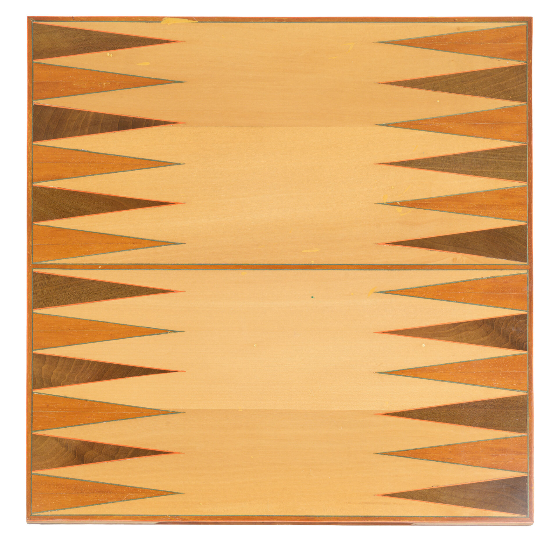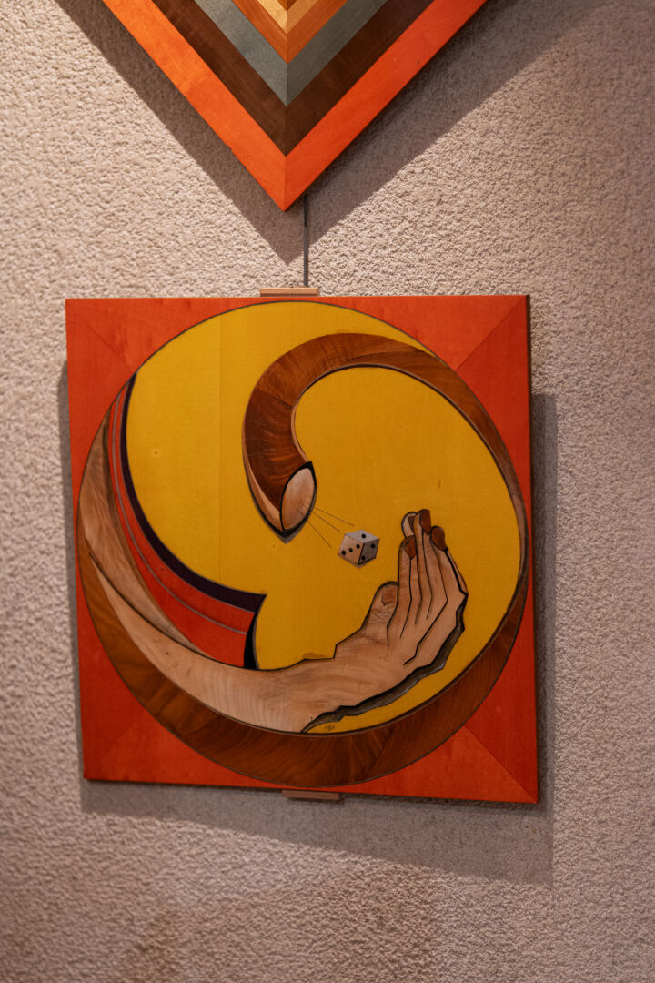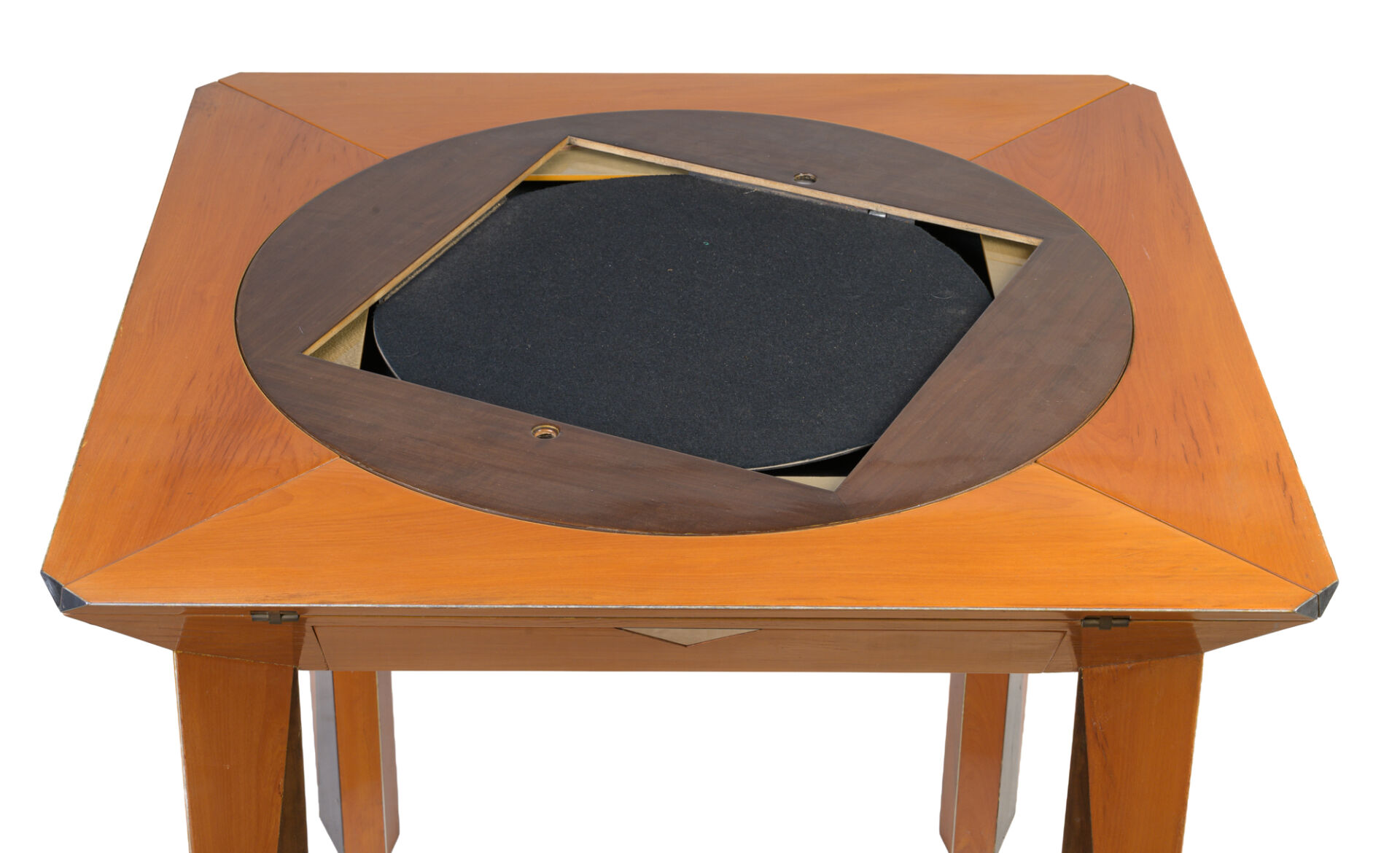 Michel BRIARD (1930-2025). Table à jeux en bois, placage et marqueterie de poirier, surmonté d'un plateau interchangeable cachant un tapis de jeux, ouvrant à quatre abattants pour agrandir la table en hexagone et à un tiroir secret en ceinture. Trois plateaux sont fournis avec la table : un plateau d'échiquier, un plateau de backgammon dit tric-trac et un plateau décoratif à décor d'une main attrapant un dé. H : 76, 5 cm ; L : 83,5 cm ; l : 83,5 cm H : 76, 5 cm ; L : 113 cm ; l : 113 cm ouverte
