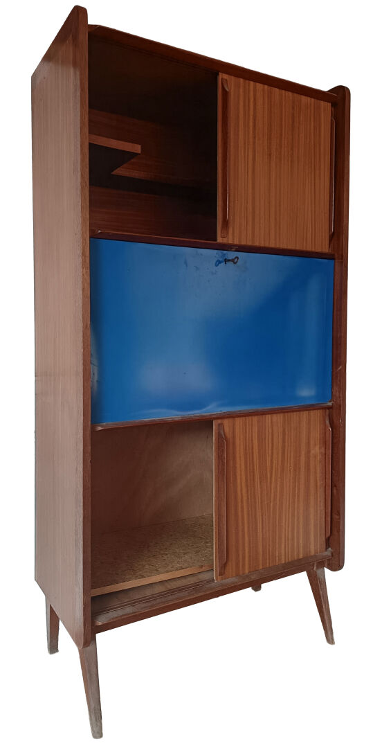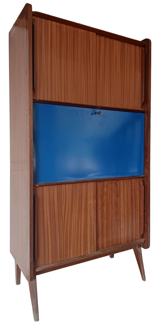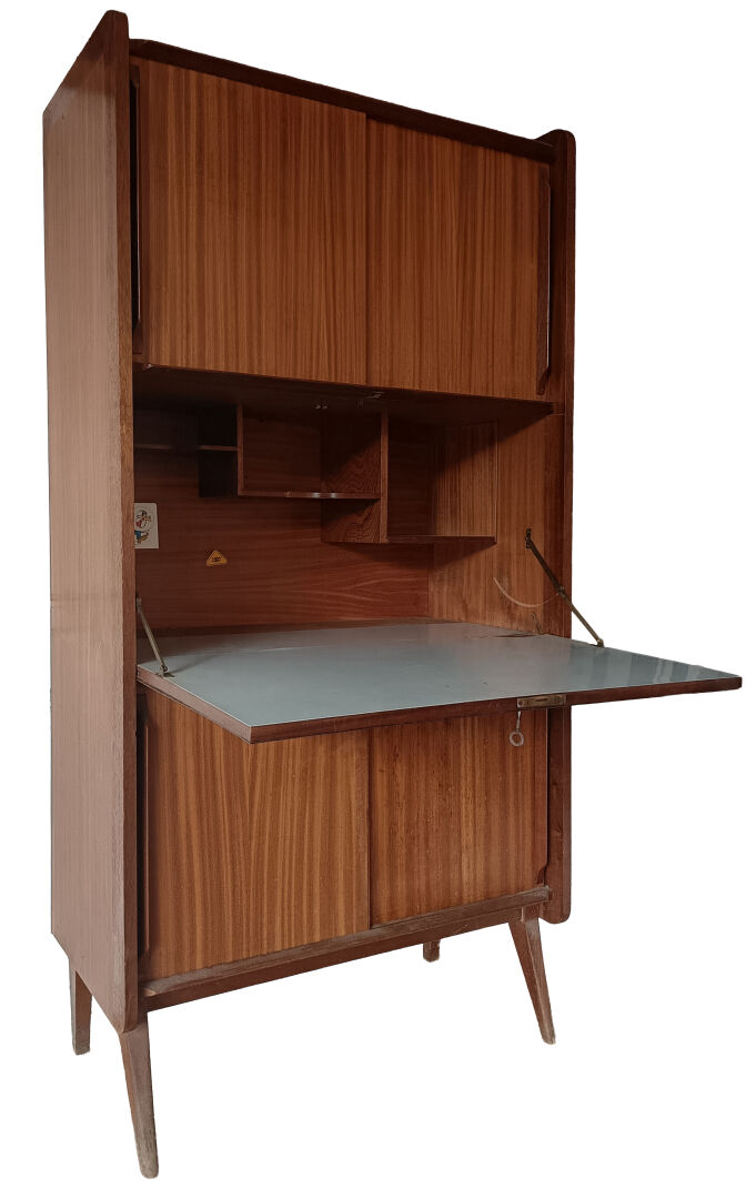 Michel BRIARD (1930-2025). Secrétaire à abattant en bois et placage d'acajou ouvrant à quatre vantaux coulissants et un abattant en formica. Vers 1950. Manques. H :174 cm ; L : 85 cm ; l : 44cm
