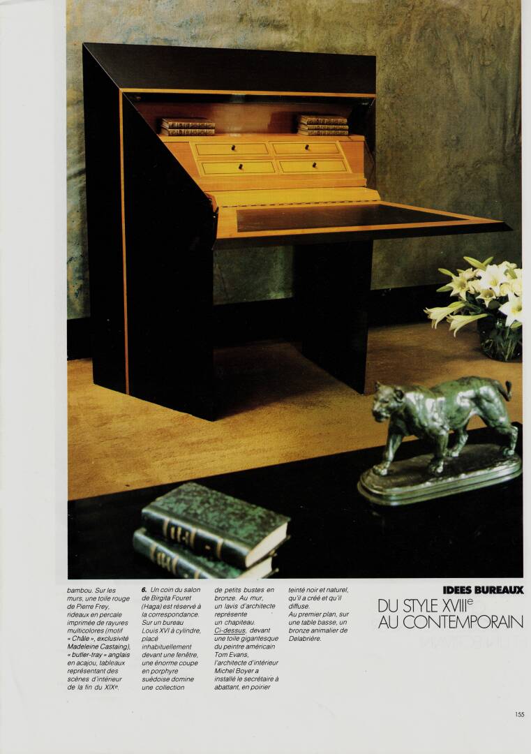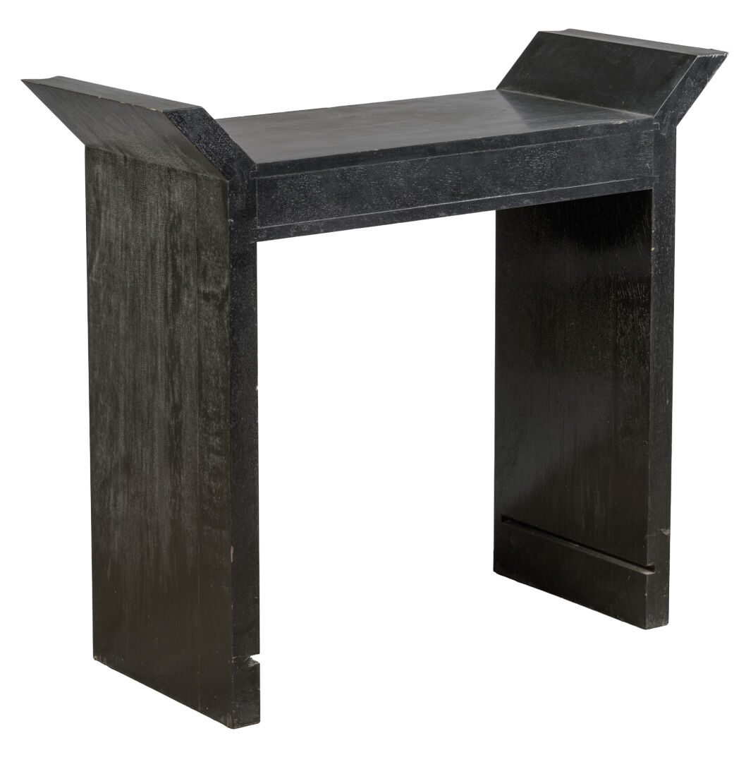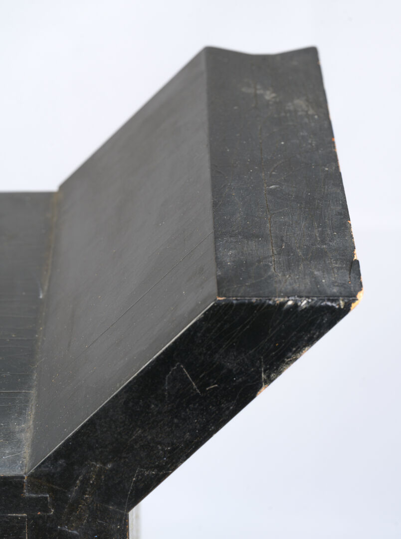 Michel BOYER (1935-2011) par Atelier Michel BRIARD. Console en bois teinté noir. Manque le plateau et la tablette en verre. Vers 1980. H : 90 cm ; L : 103 cm ; l : 39 cm L'atelier Michel BRIARD exécutait ces consoles dessinées par le designer Michel BOYER. En 1984, Michel BRIARD forme un duo avec Michel BOYER lors d'un concours de l'assemblée permanente des chambres de Métiers, où onze créateurs et onze ébénistes français sont sélectionnés et sont regroupés en duo pour réaliser un ensemble de meubles. Leur collaboration commence et ils exposent un secrétaire au Salon des Artistes Décorateurs de 1984 au Grand Palais. Ce secrétaire est publié dans la revue « Maison Française » de novembre 1986. La dernière photo est une illustration de ce secrétaire.