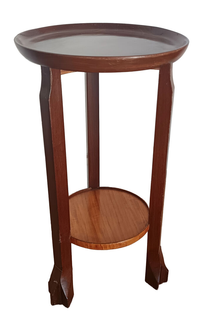 Michel BRIARD (1930-2025). Bout de canapé en bois sculpté et placage d'acajou et poirier, avec un deuxième plateau amovible. H : 46 cm ; D : 25 cm