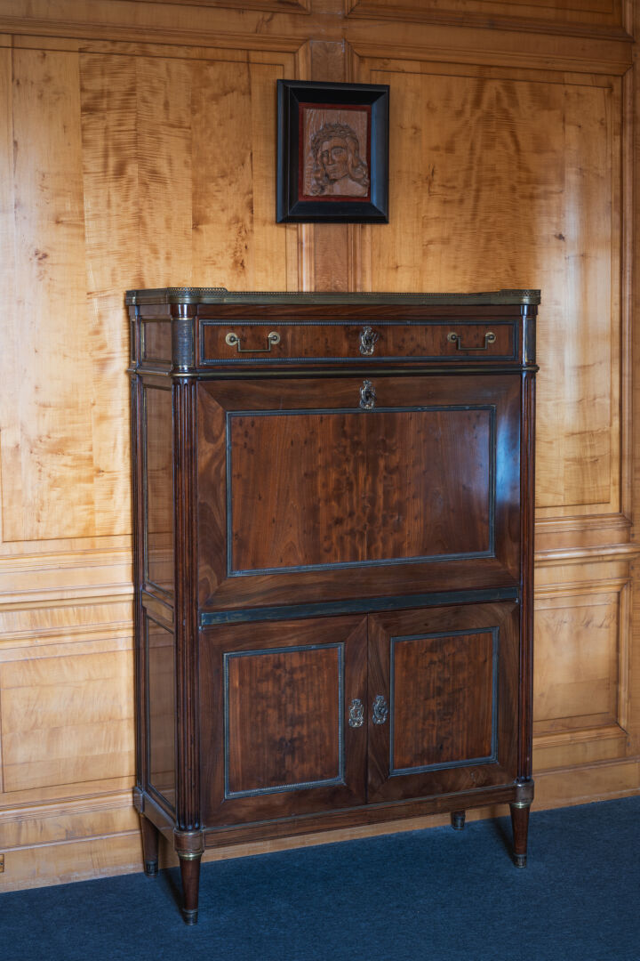 Secrétaire à abattant en bois et placage d'acajou, dessus marbre ouvrant à un tiroir, un abattant et deux vantaux, reposant sur quatre pieds fuselés. Époque Louis XVI. Restaurations par l'atelier Michel BRIARD. H : 142,5 cm ; L : 93 cm ; l : 38 cm
