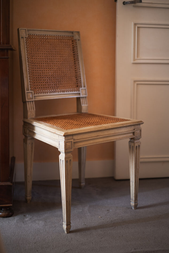 Atelier Michel BRIARD. Suite de six chaises en bois peint, mouluré et sculpté, dossier et assise cannés, reposant sur quatre pieds cannelés. Style Louis XVI. H : 88 cm ; L : 43 cm ; l : 46 cm