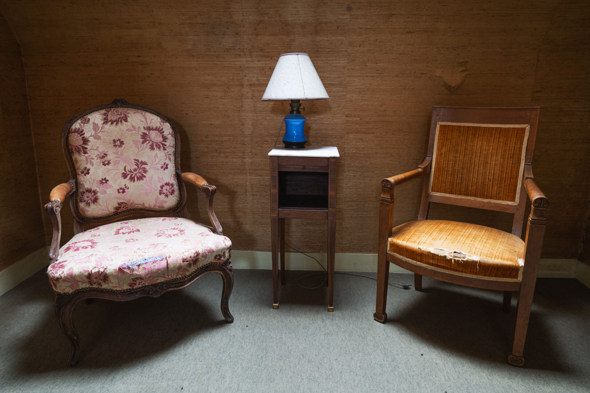 Paire de fauteuils à la reine en bois mouluré et sculpté, supports d'accotoir en coup de fouet, reposant sur quatre pieds courbés. Garniture en tissu. Époque Louis XV. Restaurations par l'atelier Michel BRIARD. H : 93 cm ; L : 58 cm ; l : 63 cm