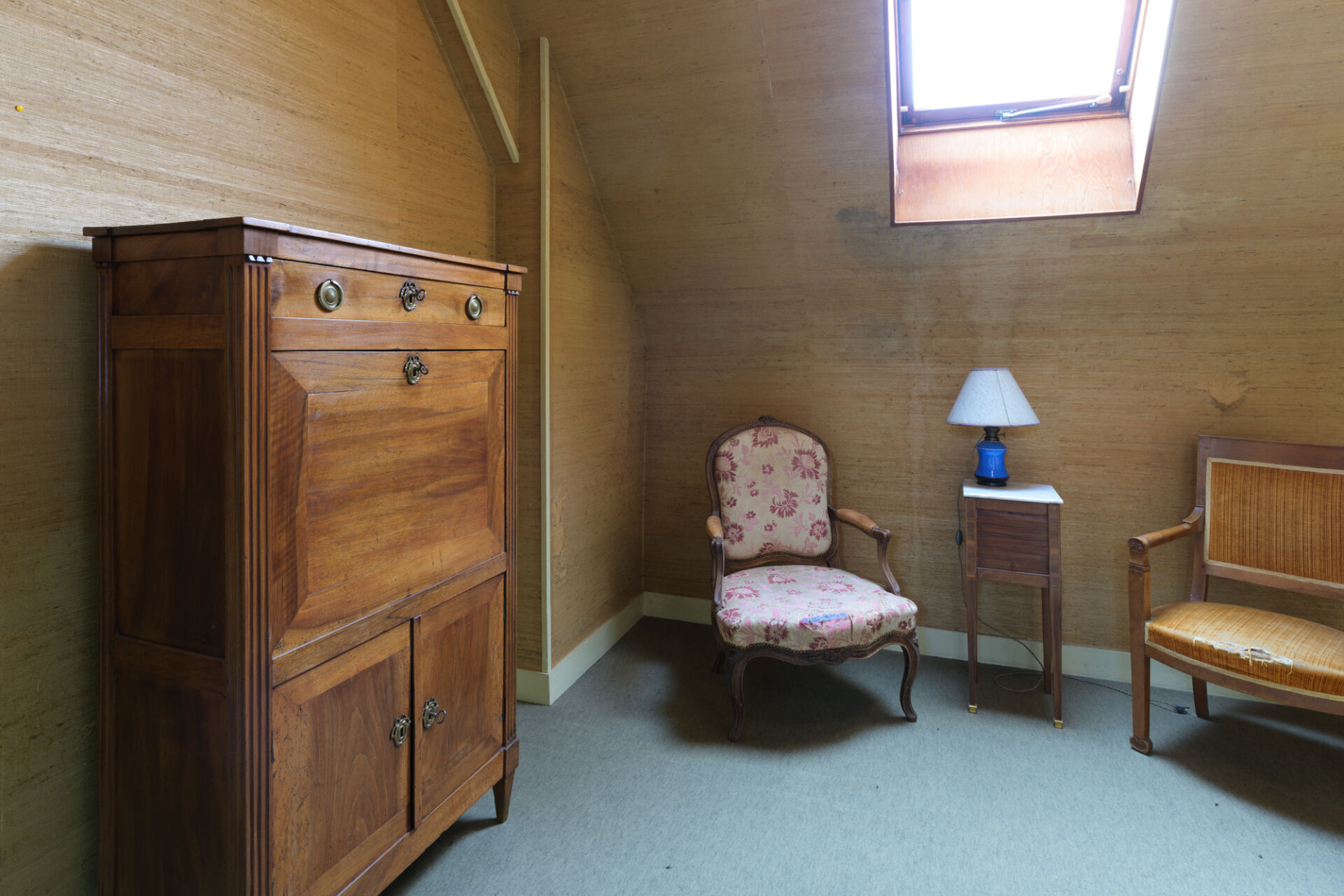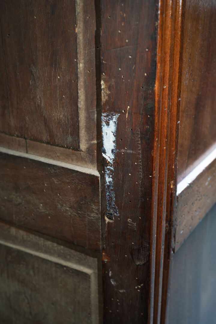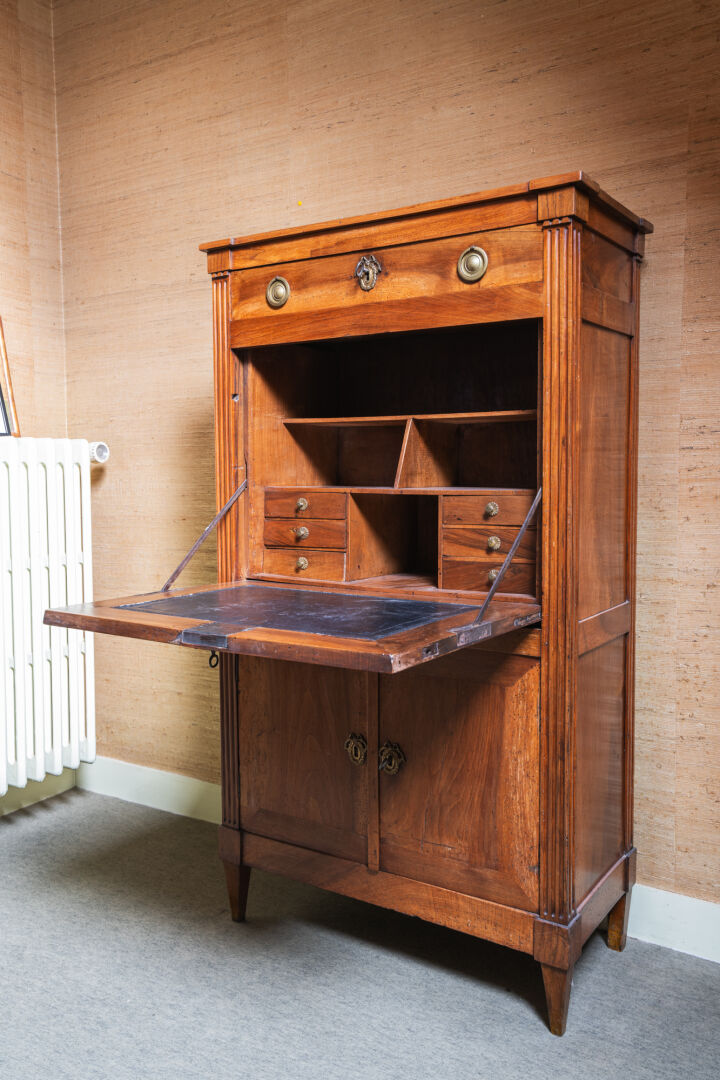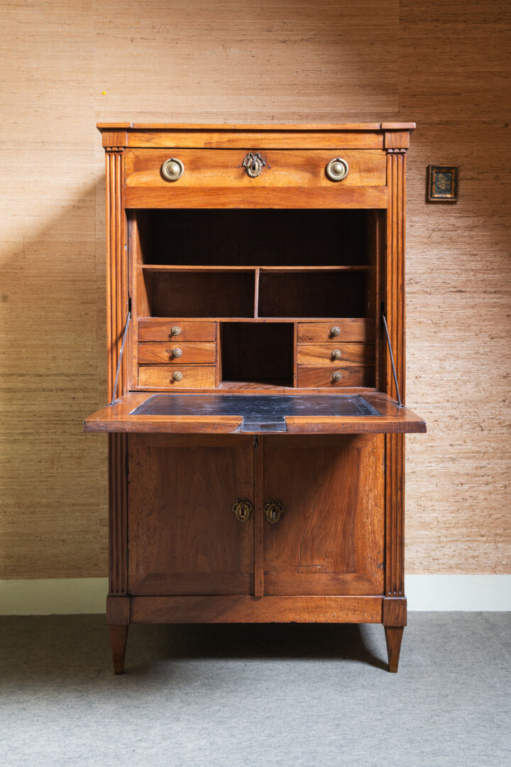 Secrétaire à abattant en bois et bois de placage, ouvrant à un tiroir, un abattant et deux vantaux, avec montants cannelés. Porte l'estampille de contrôle de la jurande et l'estampille du maître ébéniste Jean-Pierre BERTRAND (Vers 1735-1808). Époque Louis XVI. Restaurations par l'atelier Michel BRIARD. H : 139 cm ; L : 78,5 cm ; l : 38 cm Jean-Pierre BERTRAND passa maître-ébéniste à Paris le 1er mars 1775. Il exerça rue du Faubourg-Saint-Antoine, où il produisait des petits meubles en bois de rose et en acajou moucheté, comme des tables à trois fins, à gradins et "en secrétaire à cylindre".