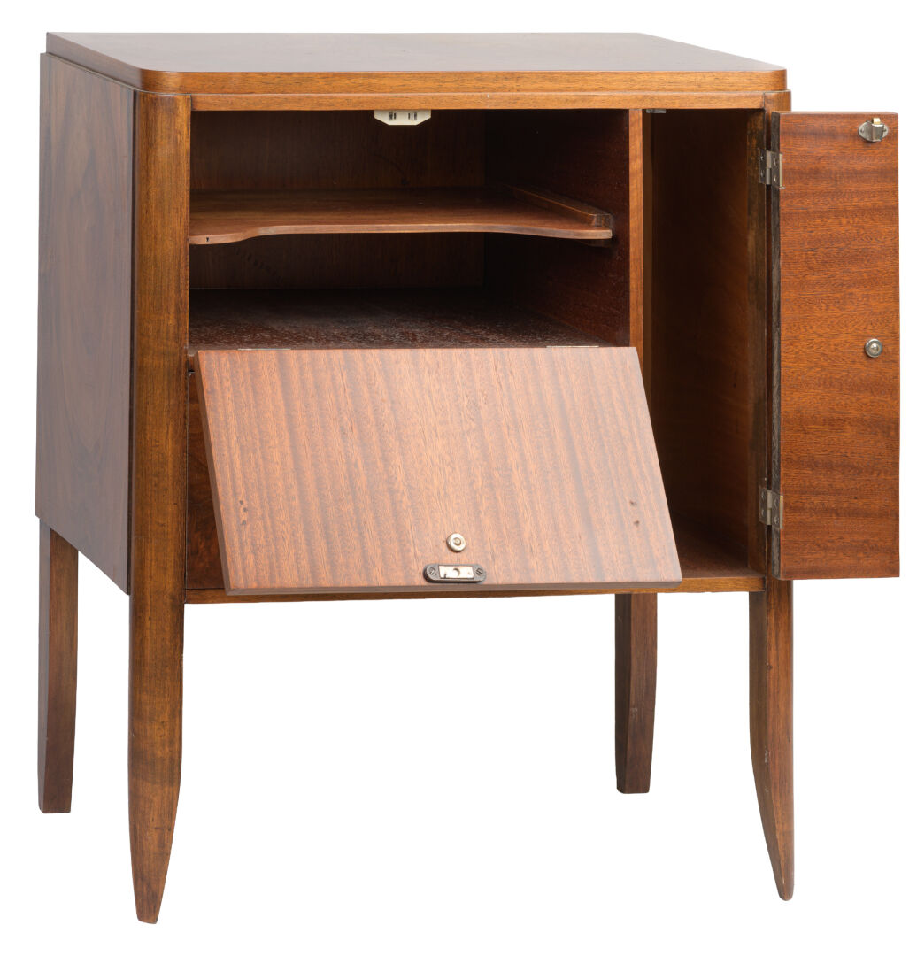 Chevet en bois dans le goût Art Déco, ouvrant à deux tiroirs et un vantail. Vers 1930. Restaurations par l'atelier Michel BRIARD. H : 76 cm ; L : 64 cm ; l : 38 cm