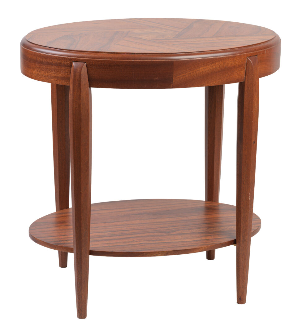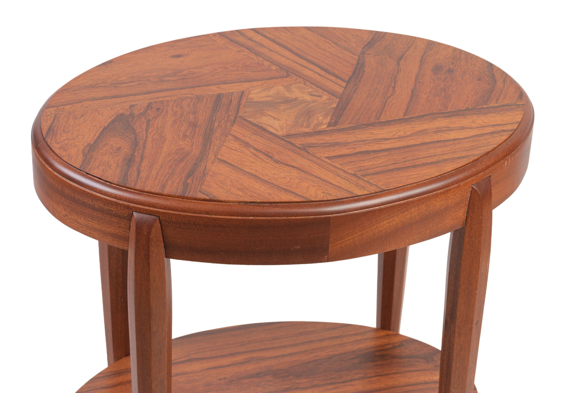 Table volante en bois, placage et marqueterie d'acajou, reposant sur quatre pieds joints par une tablette. Époque Art Déco. Restaurations par l'atelier Michel BRIARD. H : 60 cm ; L : 59 cm ; l : 42 cm