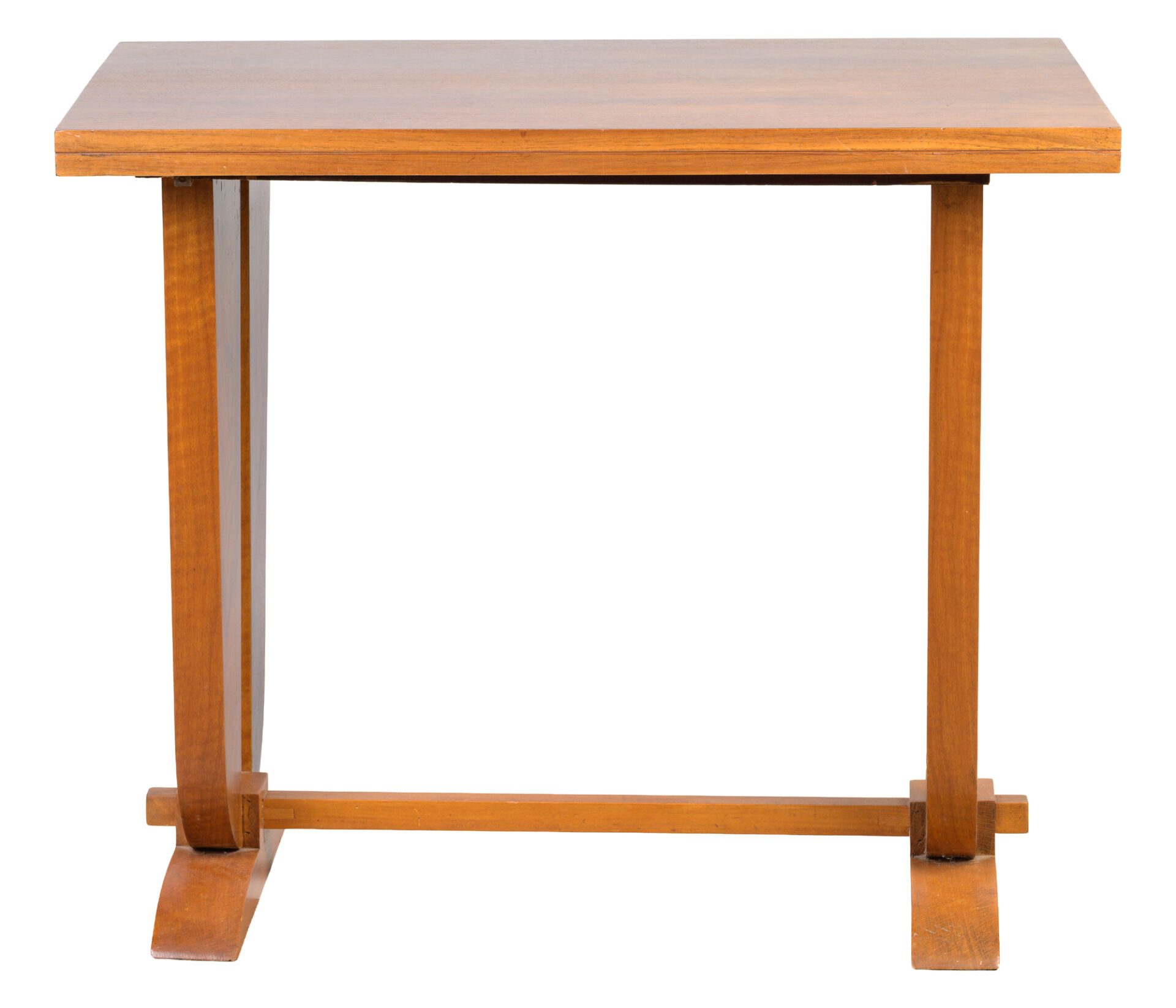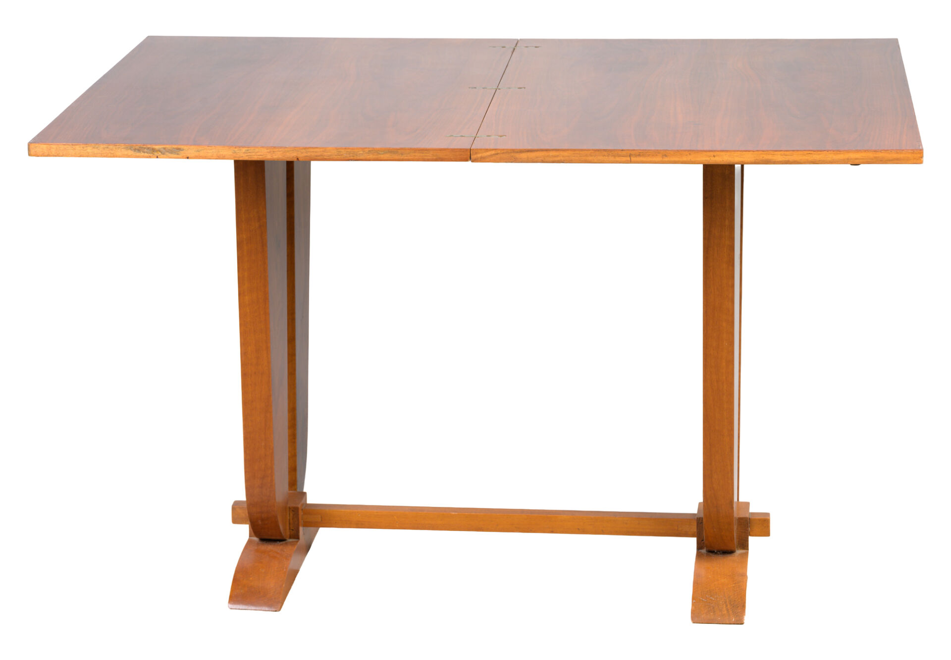 Table en bois de noyer s'ouvrant avec un abattant. Époque Art Déco. Restaurations par l'atelier Michel Briard. H : 75 cm ; L : 120 cm ; l : 90 cm (ouverte) H : 75 cm ; L : 90 cm ; l : 60 cm