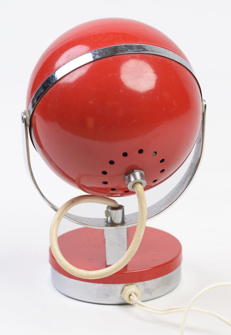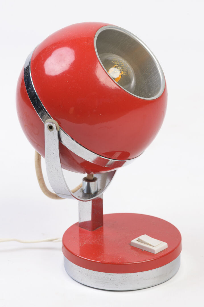 Dans le goût space age. Lampe à poser dite "eye ball" en métal rouge et métal chromé. H : 21 cm ; D : 14 cm