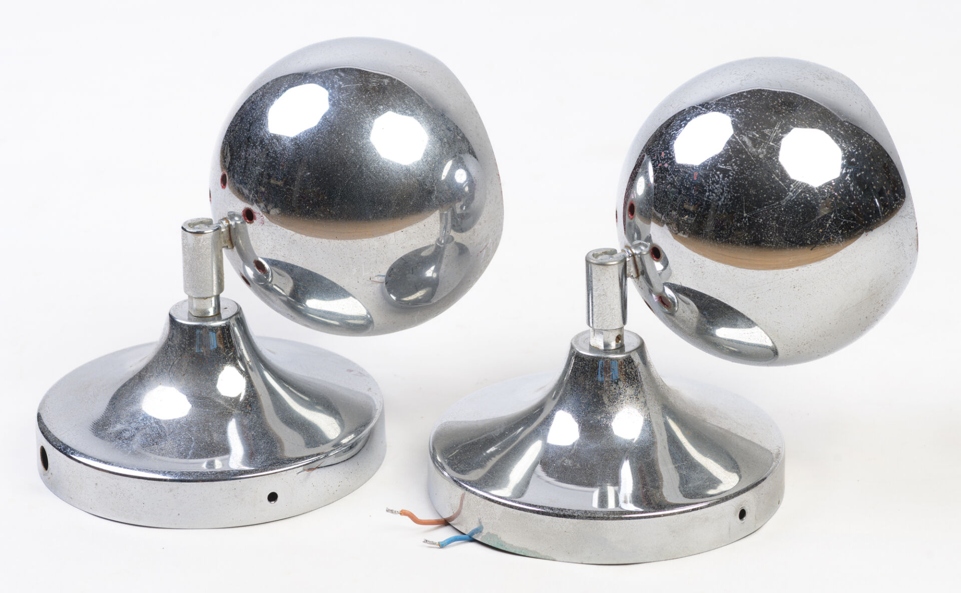 Dans le goût de Goffredo REGGIANI et space age. Paire d'appliques dites "eye ball" en métal chromé. H : 21 cm ; D : 14 cm
