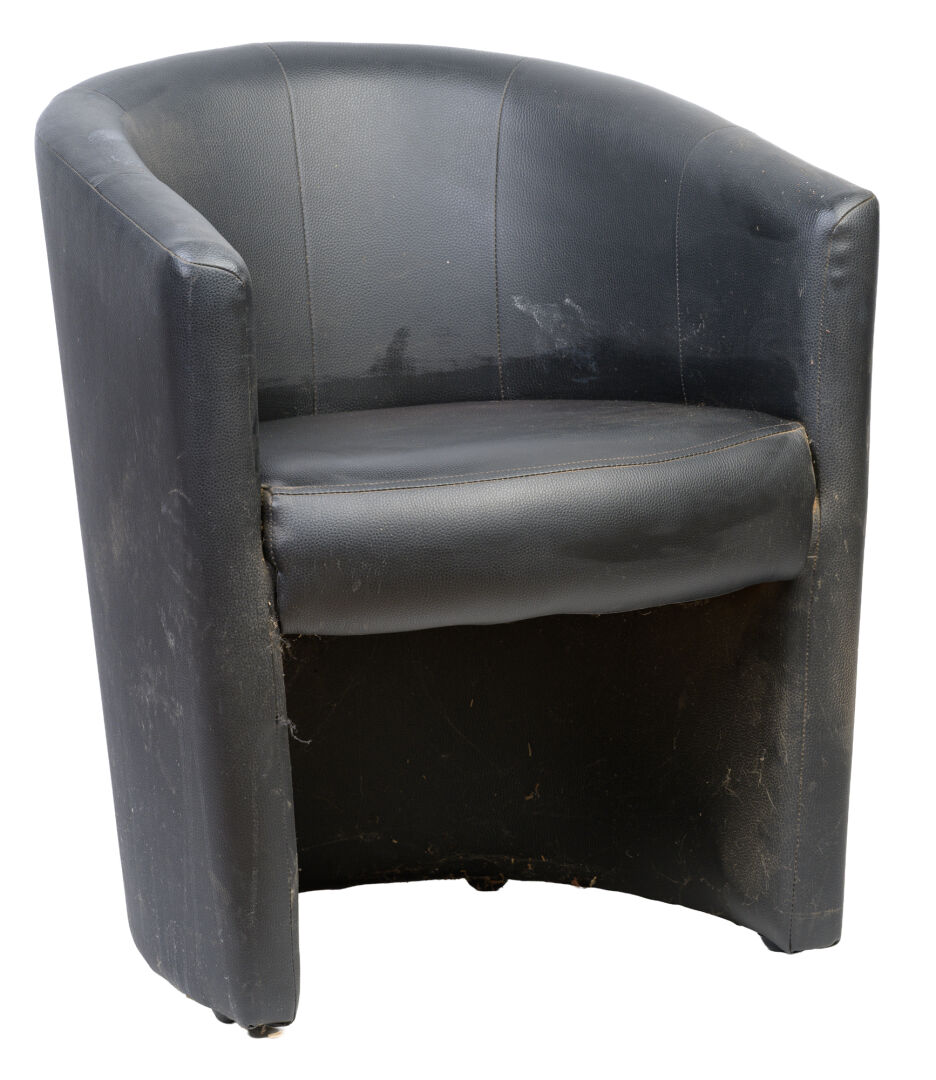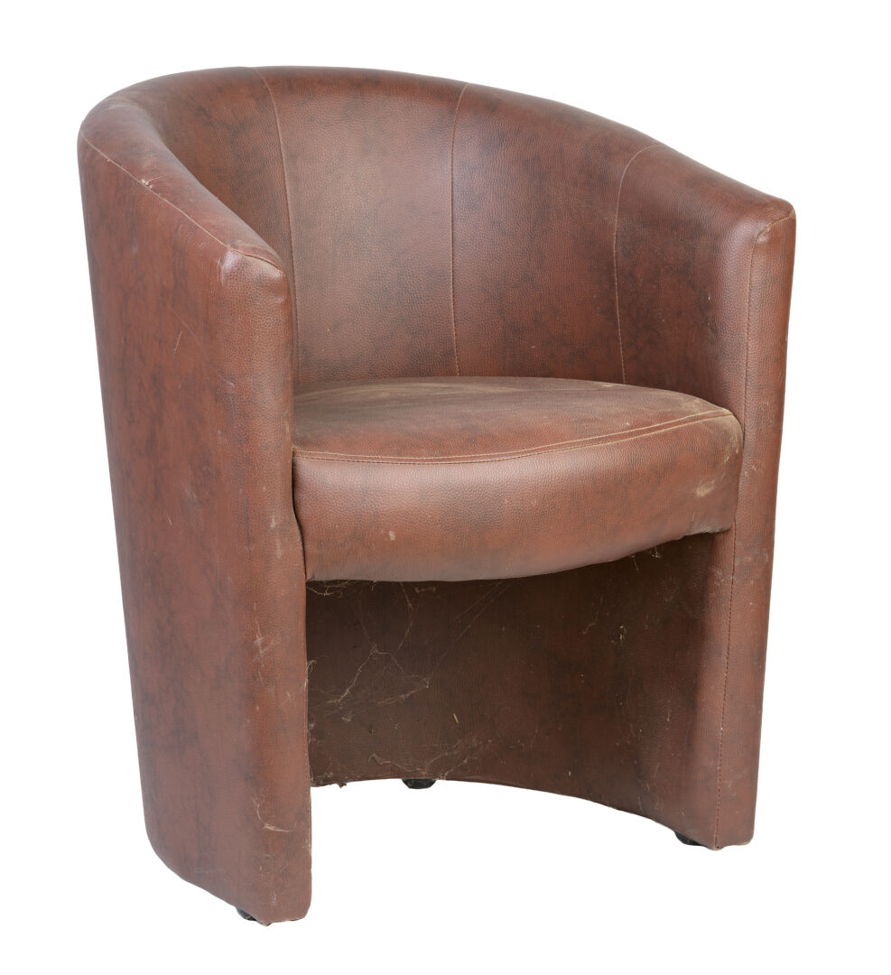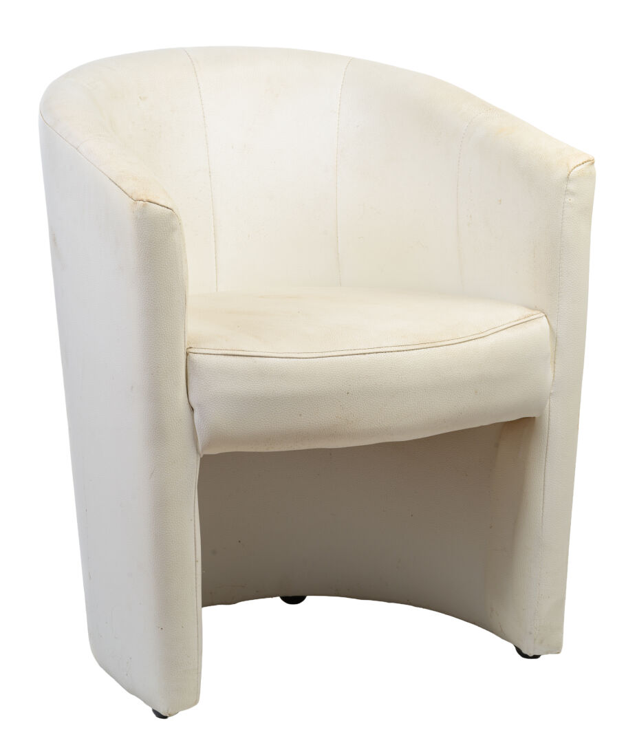 Suite de trois fauteuils club en cuir blanc, noir et marron. H : 75 cm ; L : 60 cm ; l : 58 cm