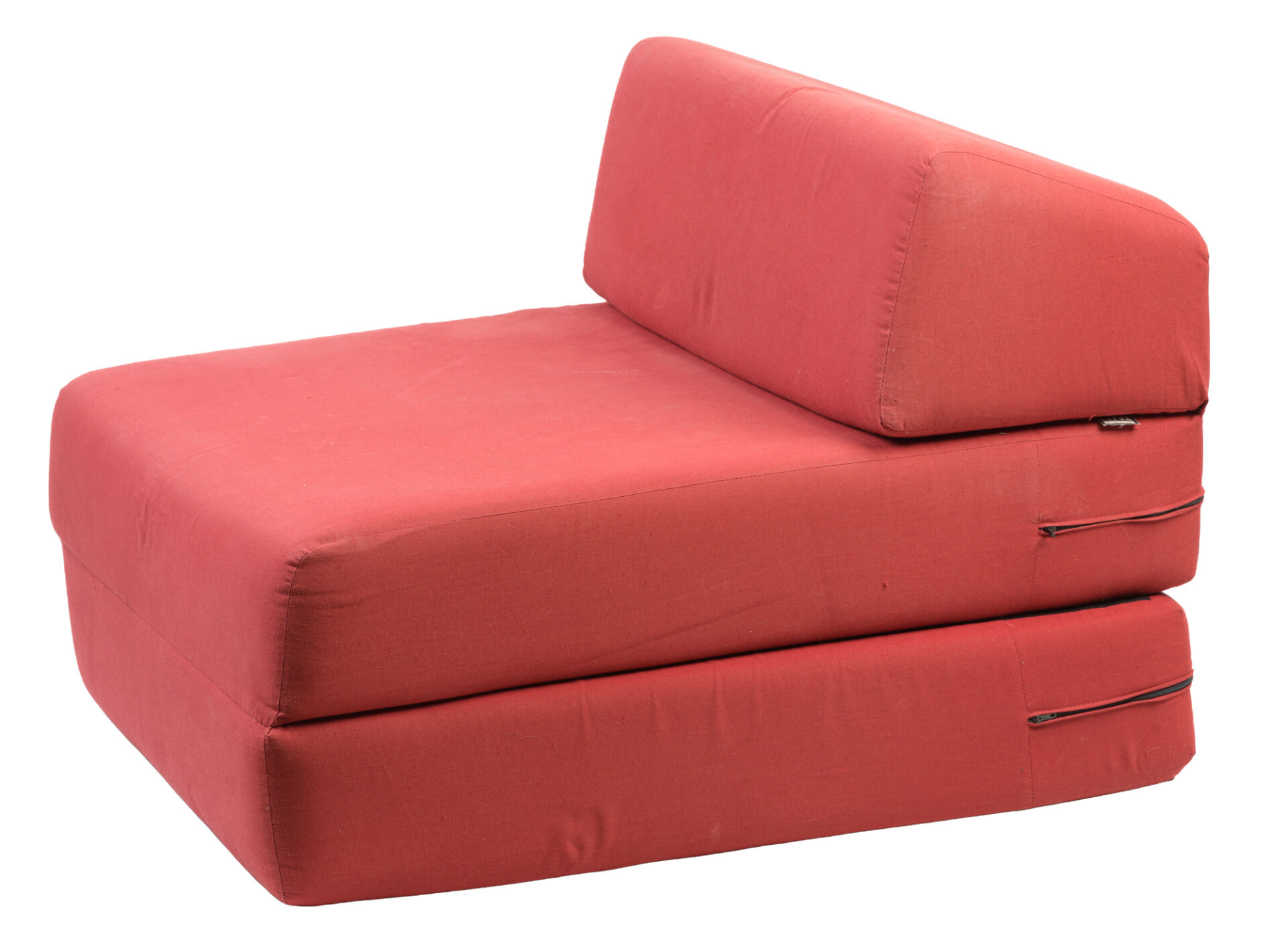 Soft Line 2000. Chauffeuse en tissu rouge, pouvant former un matelas d'appoint. Porte étiquette. H : 54 cm ; L : 74 cm ; l : 53 cm