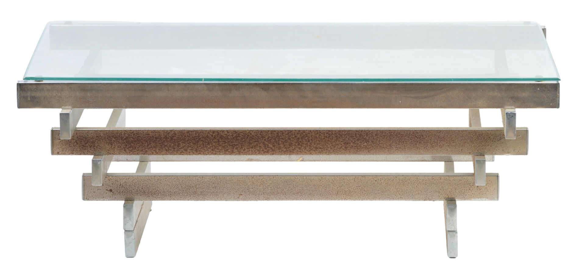 Dans le goût de David HICKS (1929-1998). Table basse avec dessus verre et piètement en métal. Vers 1970. Rayures sur le verre. H : 29 cm ; L : 78 cm ; l : 42 cm