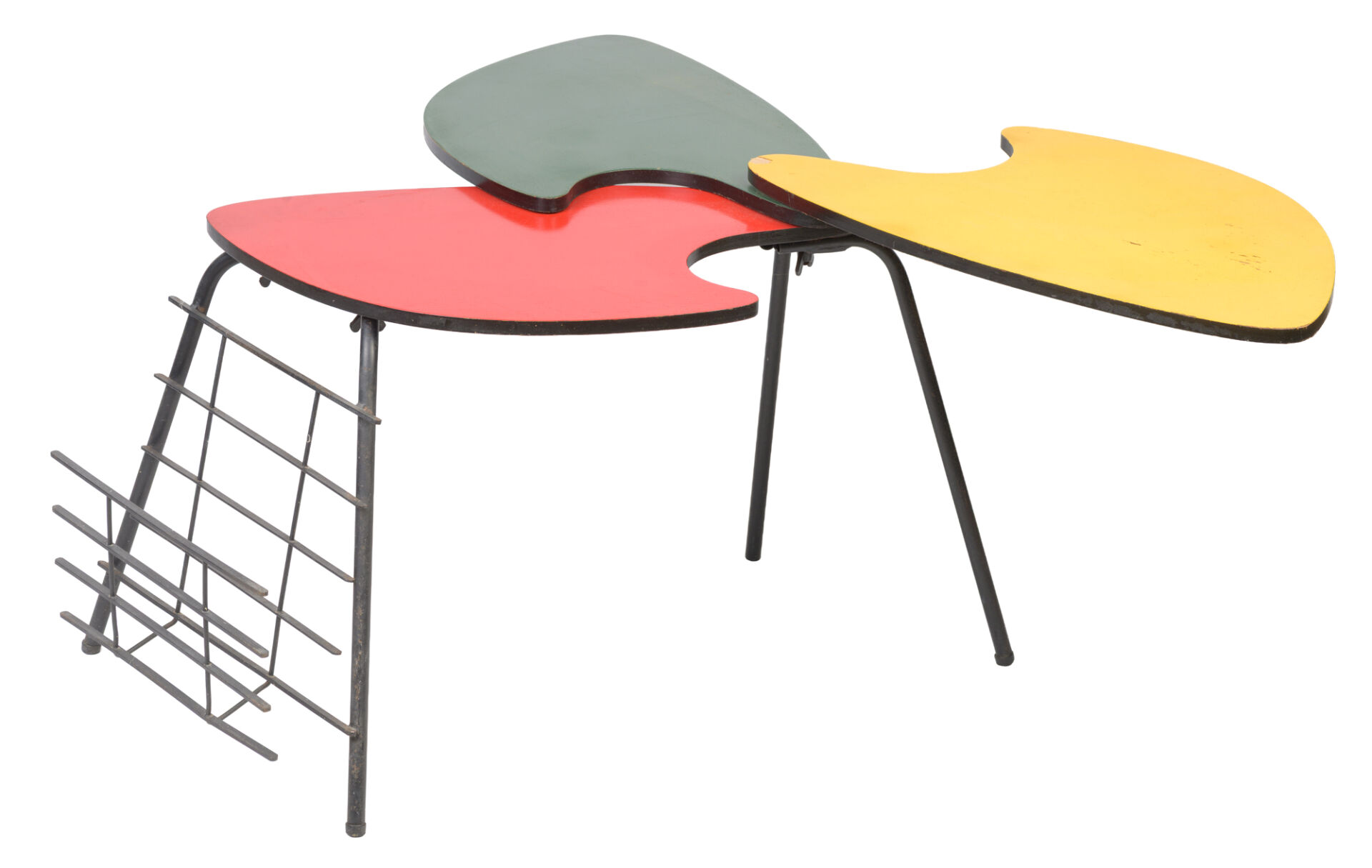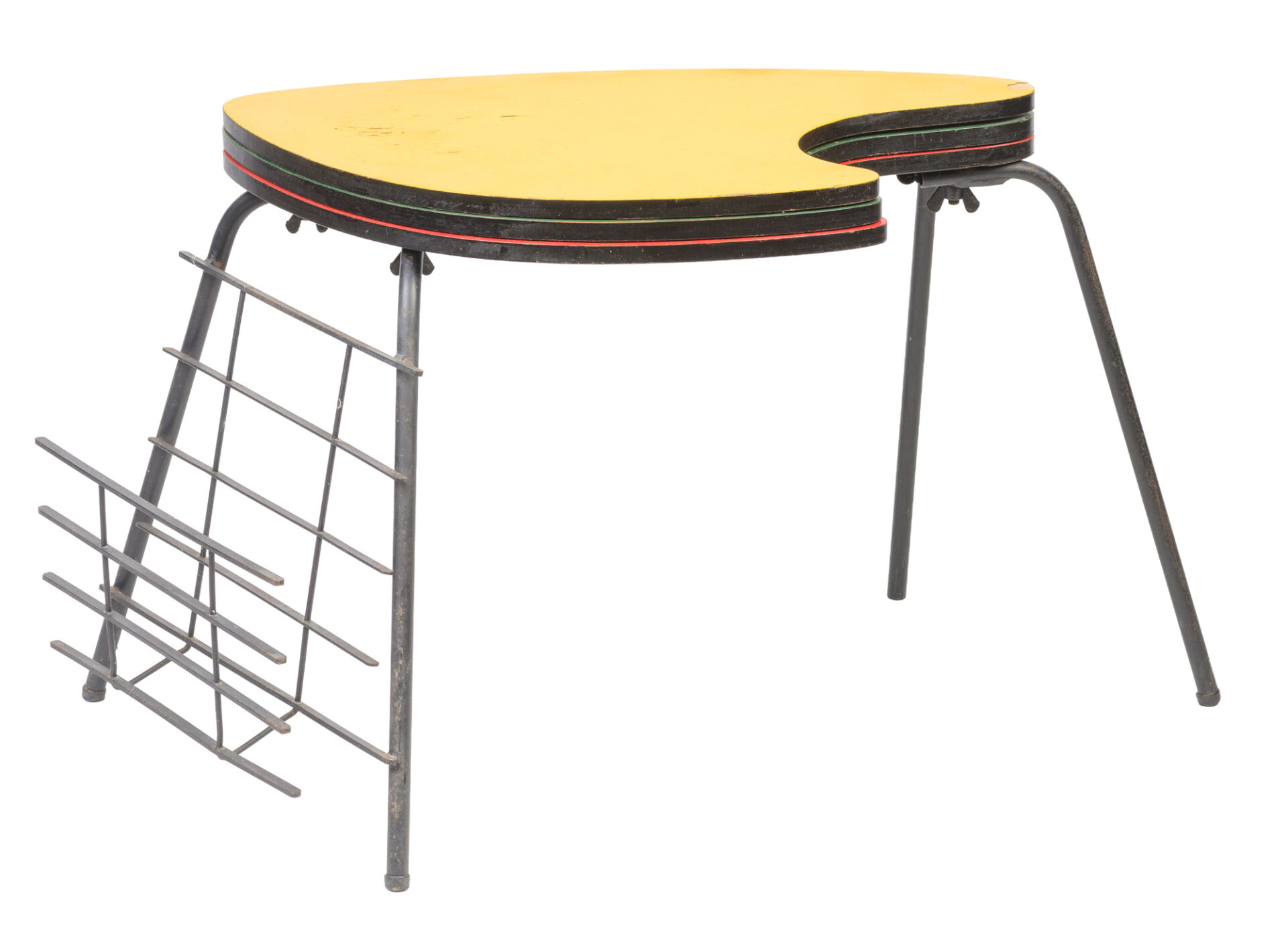 Dans le goût de Willy VAN DER MEEREN. Bout de canapé en métal noir avec porte-revue et trois tablettes en formica jaune, rouge et vert dont deux pivotantes. Accident tablette jaune H : 42,5 cm ; L : 110 cm (dépliée) ; l : 46 cm