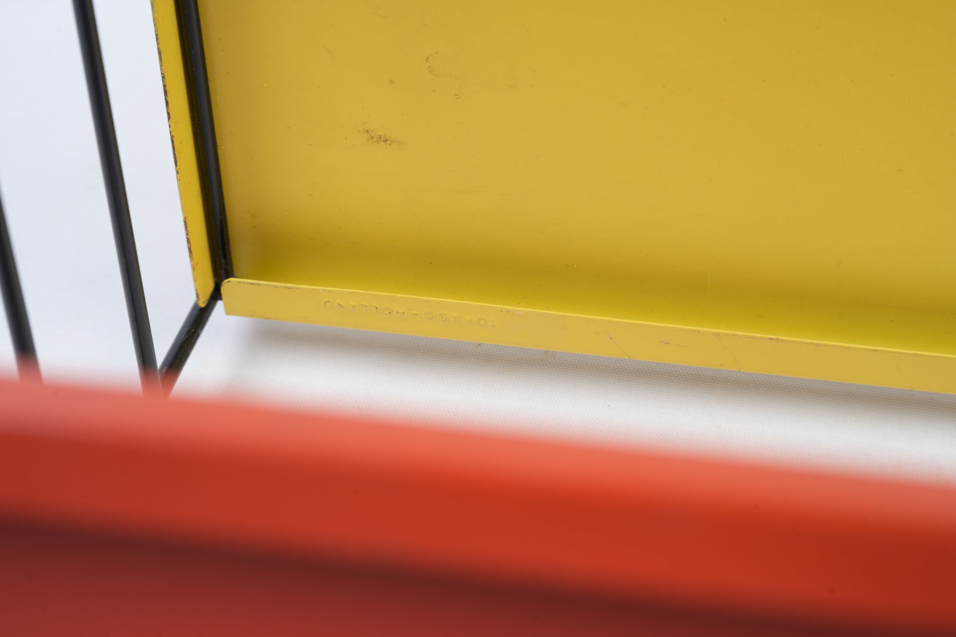 Adriaan DEKKER (1923-1982) pour Tomado. Étagères dites "String" à deux montants et trois tablettes en métal jaune, blanc ou rouge. Vers 1960-1970. H : 61 cm ; L : 48 cm ; l : 14 cm