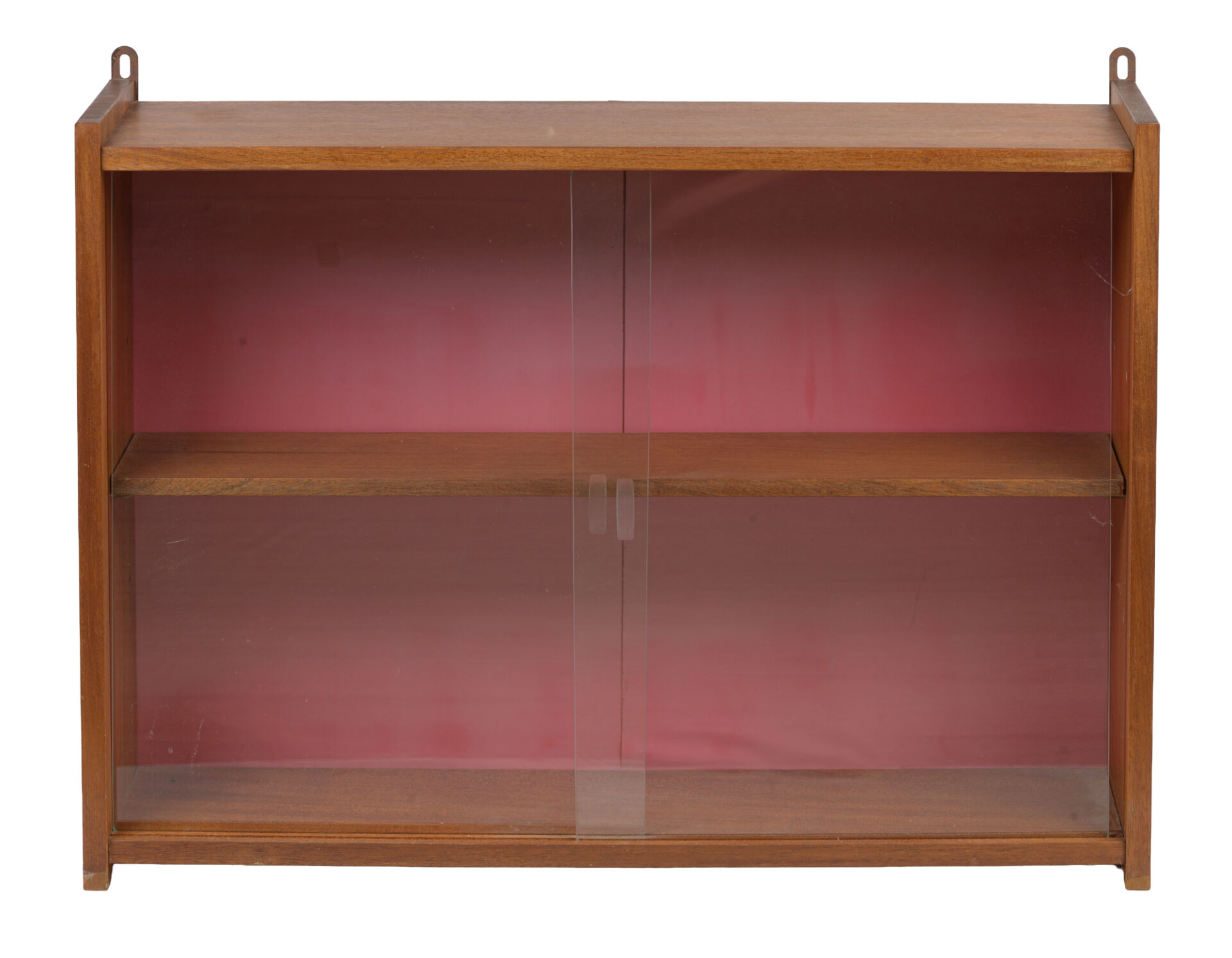 Bibliothèque à suspendre en bois et ouvrant à deux vantaux coulissants en verre. Vers 1960. H : 55 cm ; L : 76 cm ; l : 20 cm