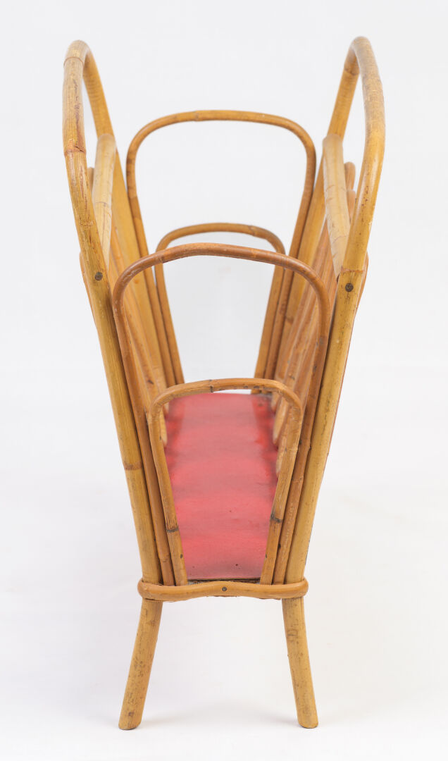 Porte-revue en rotin. Vers 1960. H : 43 cm ; L : 42 cm ; l : 23 cm