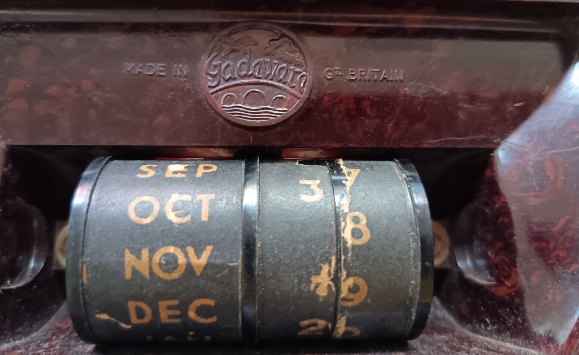 Gadaward, Grande-Bretagne. Calendrier perpétuel en bakélite marron et noire. H : 3 cm ; L : 12 cm ; l : 6 cm