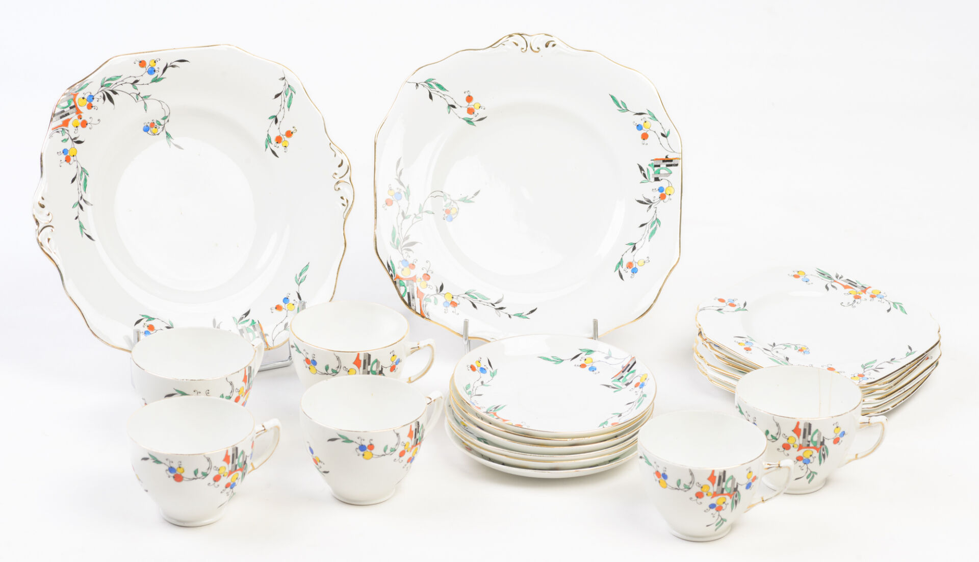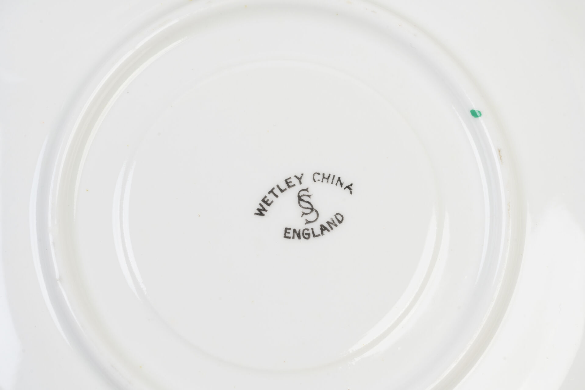 Wetley, Angleterre. Service à café en porcelaine comprenant six tasses, six sous-tasses, six assiettes et deux plats. Plats : H : 2 cm ; D : 24,5 cm Tasses : H : 6 cm ; D : 8,5 cm Assiettes : H : 1 cm ; D : 17 cm Sous-tasses : H : 1 cm ; D : 14 cm