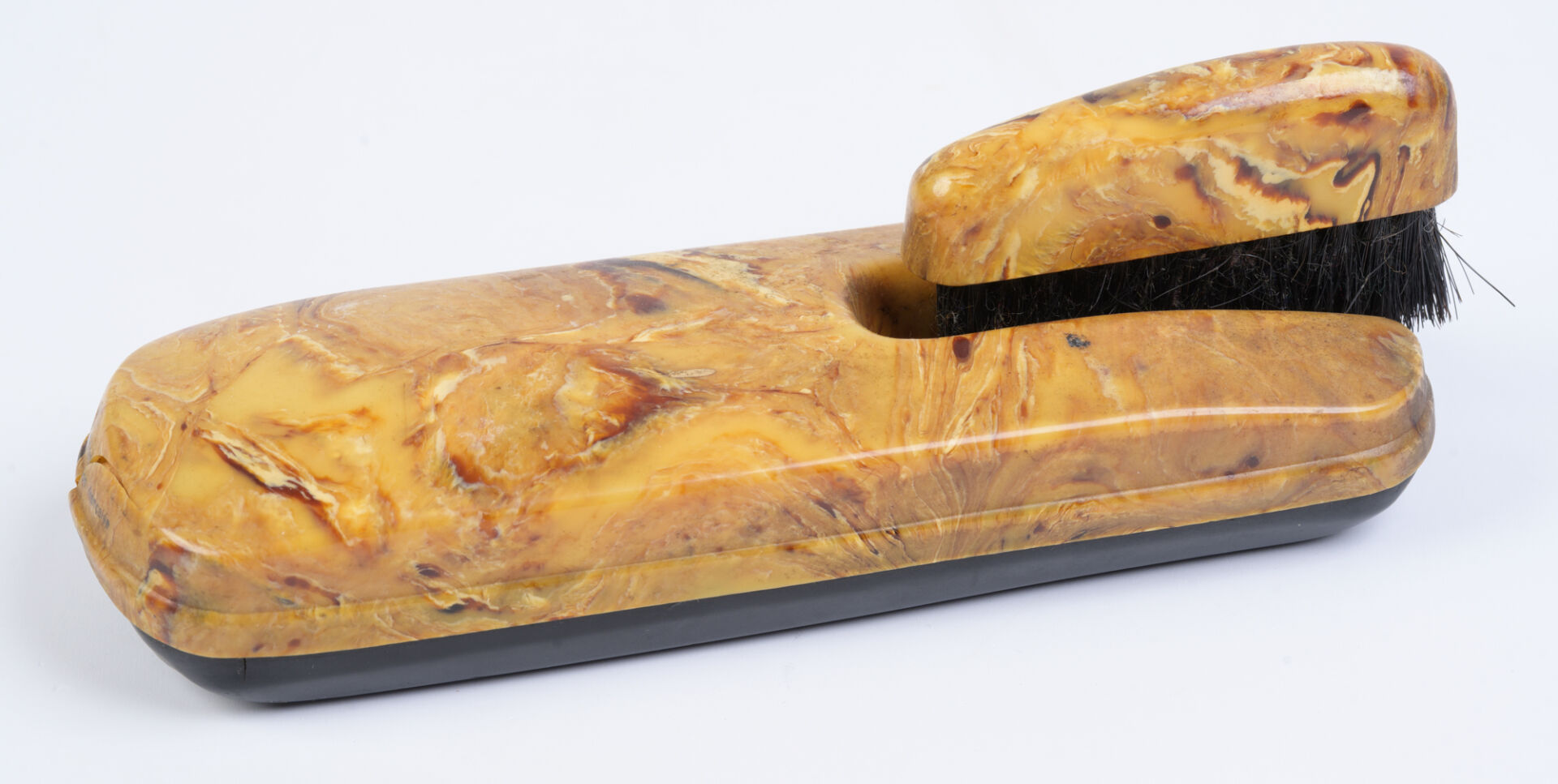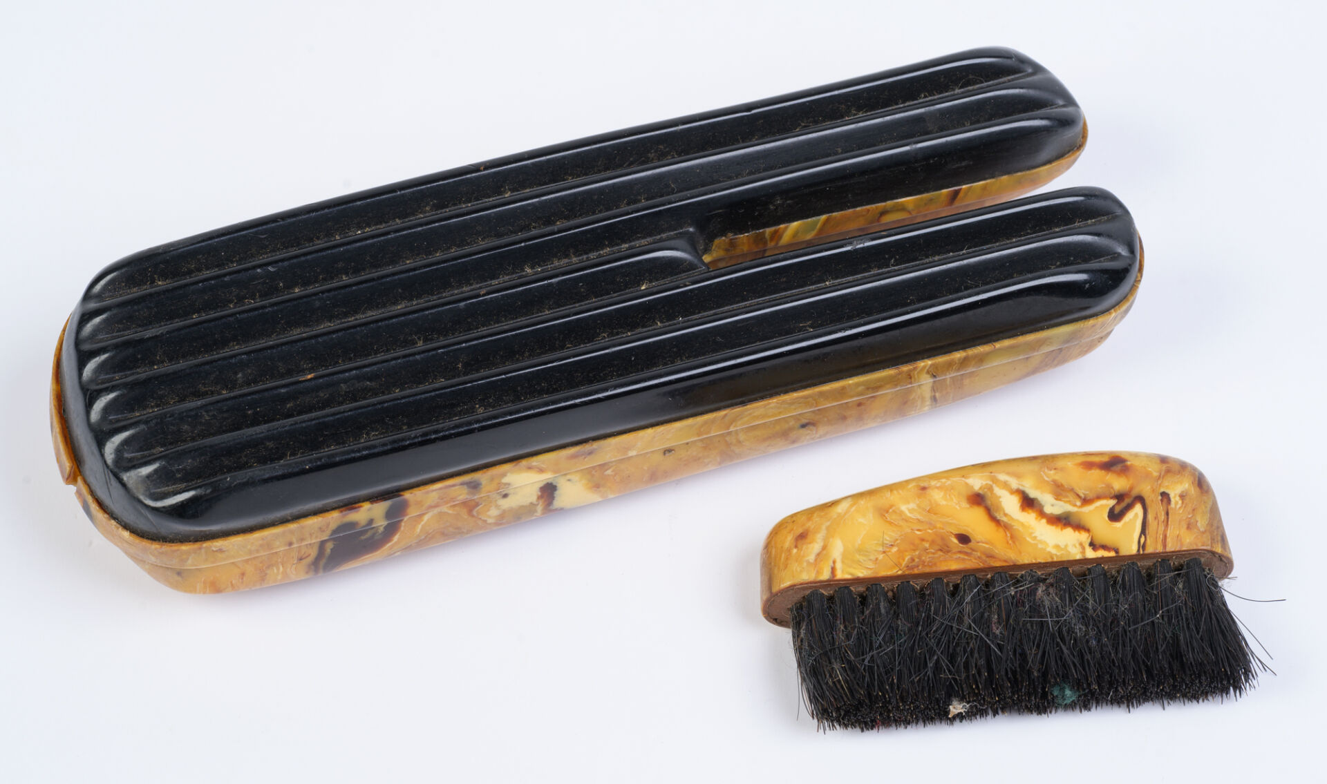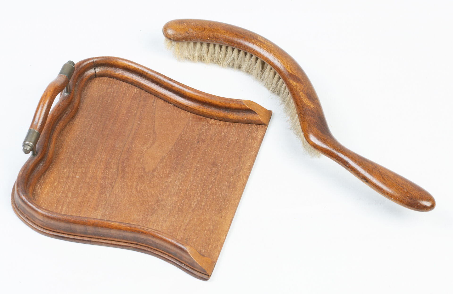 Ramasse-miettes de table en bois. On y joint une brosse à vêtements en bakélite. H : 6 cm ; L : 20 cm ; l : 20 cm H : 4 cm ; L : 31 cm ; l : 7 cm