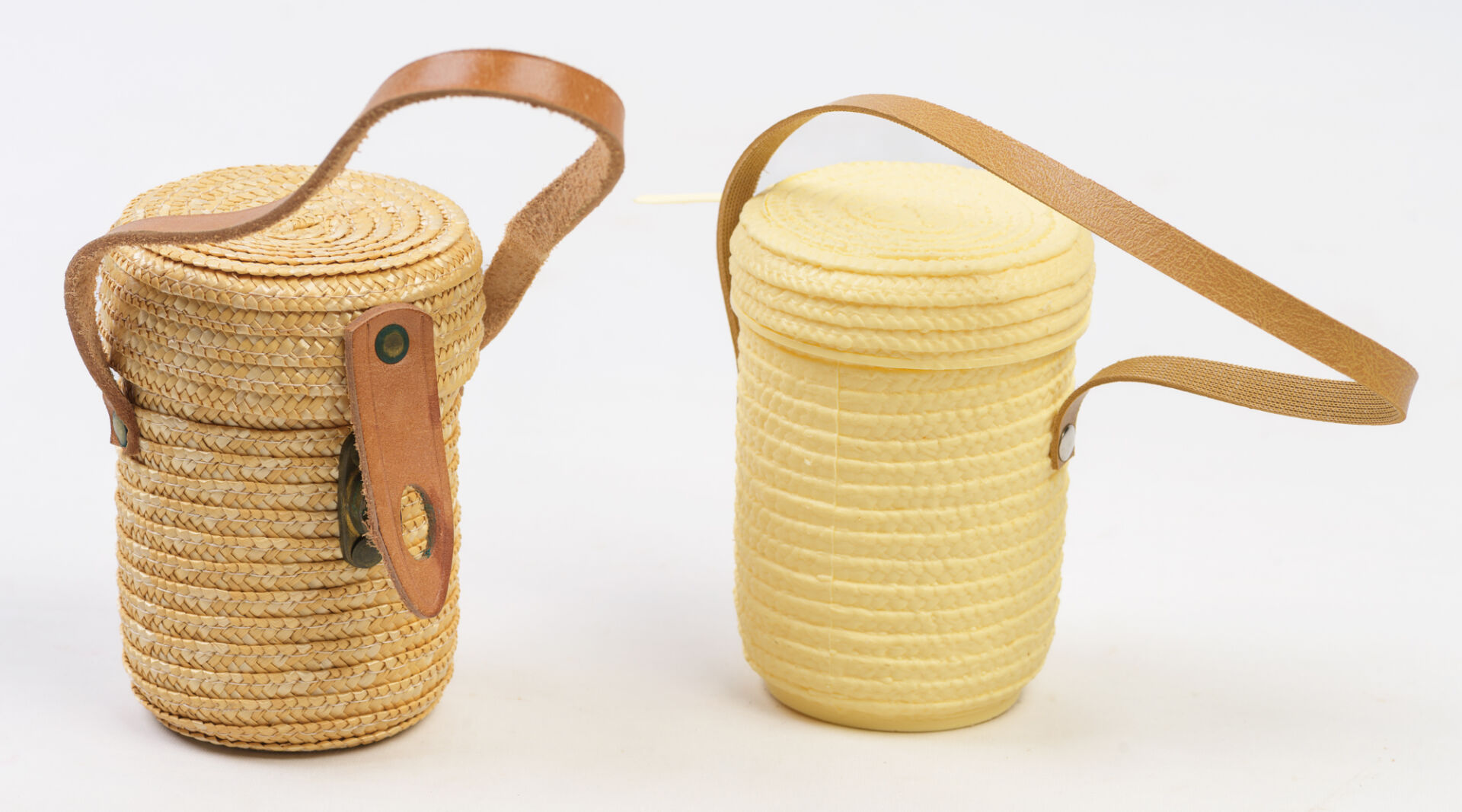 Deux gobelets de curistes dont l'un marqué "Vichy" avec son étui en paille tressée et l'autre marqué "Chaine thermale du soleil" avec son étui en plastique. H : 11 cm ; D : 8 cm