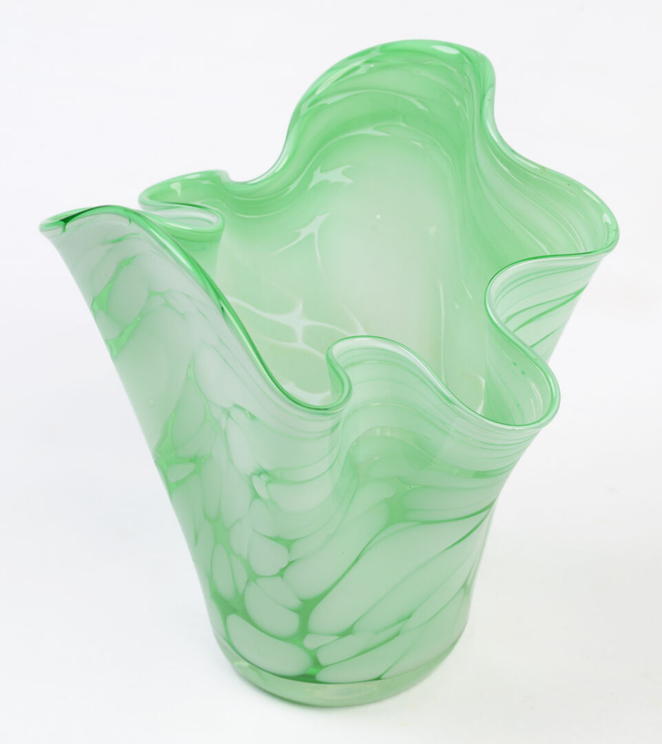 Dans le goût de Murano. Vase "mouchoir" en verre vert. H : 19 cm ; D : 16 cm