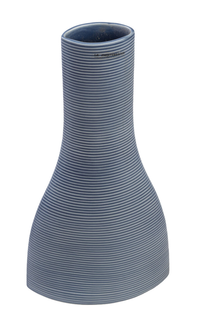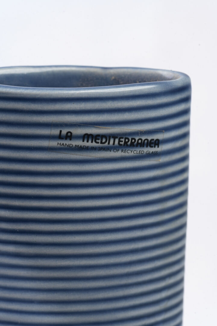 Espagne. Vase en céramique émaillée bleue. Porte étiquette "La Mediterranea". H : 42 cm ; L : 19 cm ; l : 9 cm
