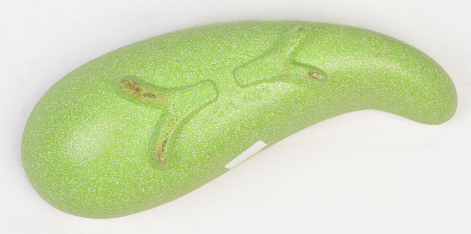 Coupe en céramique émaillée verte et jaune. Marquée sous la base "Shawnee USA". Vers 1950. Fêle. H : 7 cm ; L : 29 cm ; l : 11cm