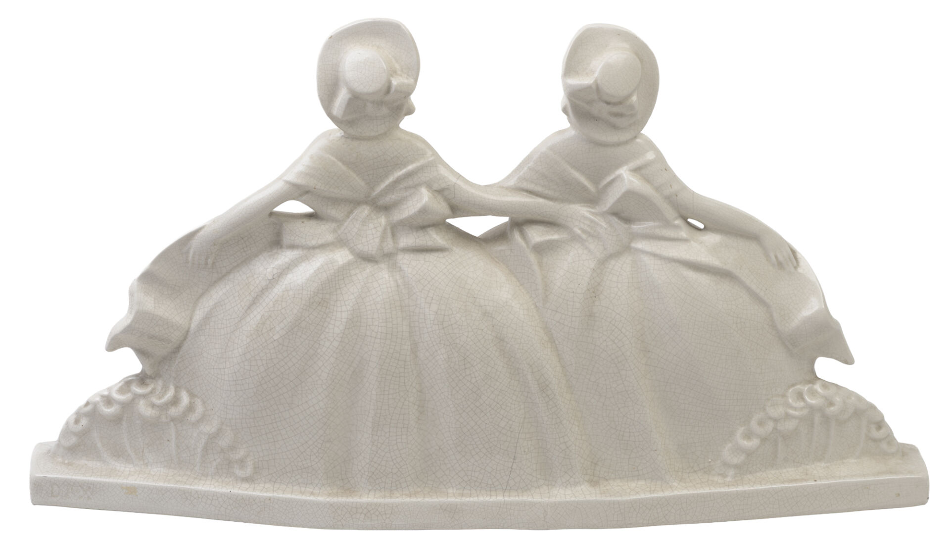 Dans le goût Art Déco. "Deux élégantes en crinoline". Sujet en faïence émaillée blanche. H : 34 cm ; L : 58 cm ; l : 13 cm