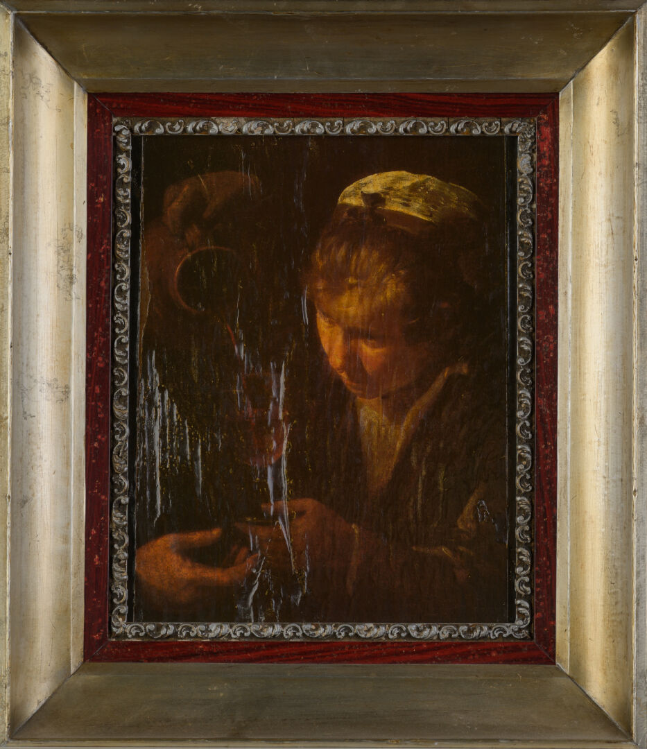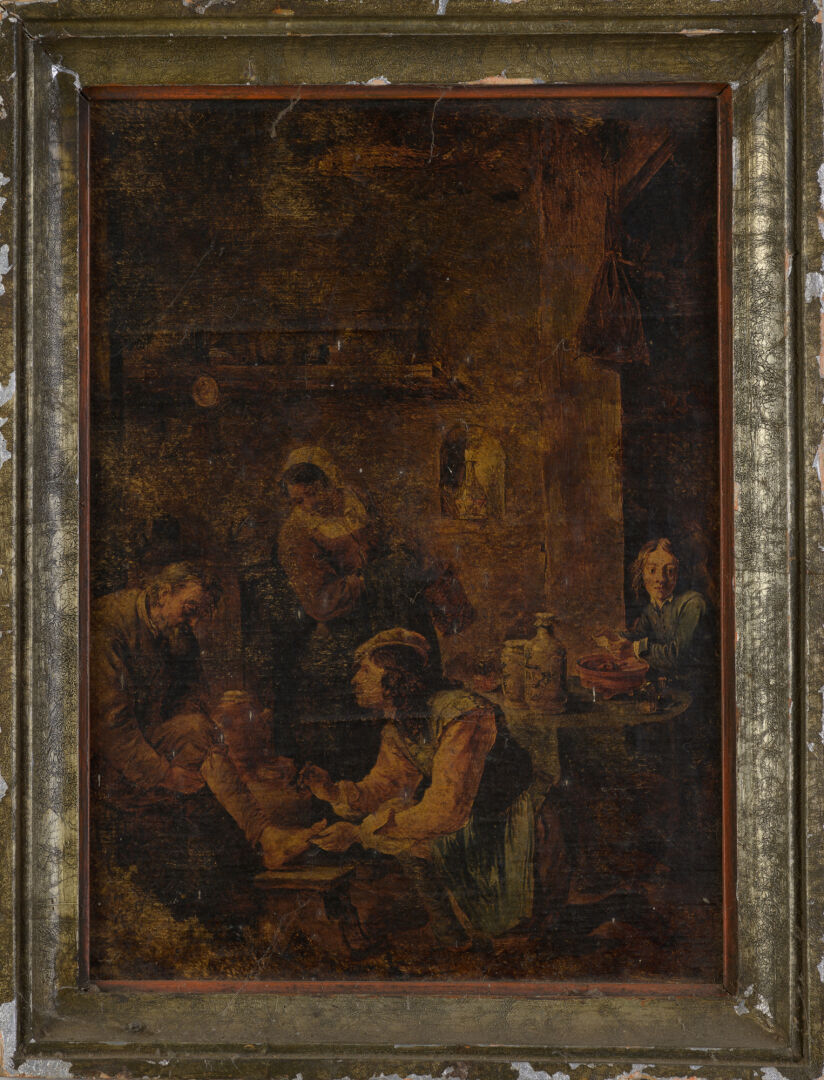 D'après Diego VELASQUEZ (1599-1660). Reproduction sur bois d'une partie du "Déjeuner des paysans". 29 x 23 cm On y joint d'après David TENIERS (1610-1690). Reproduction sur toile d'une "Scène de taverne". 32 x 23 cm