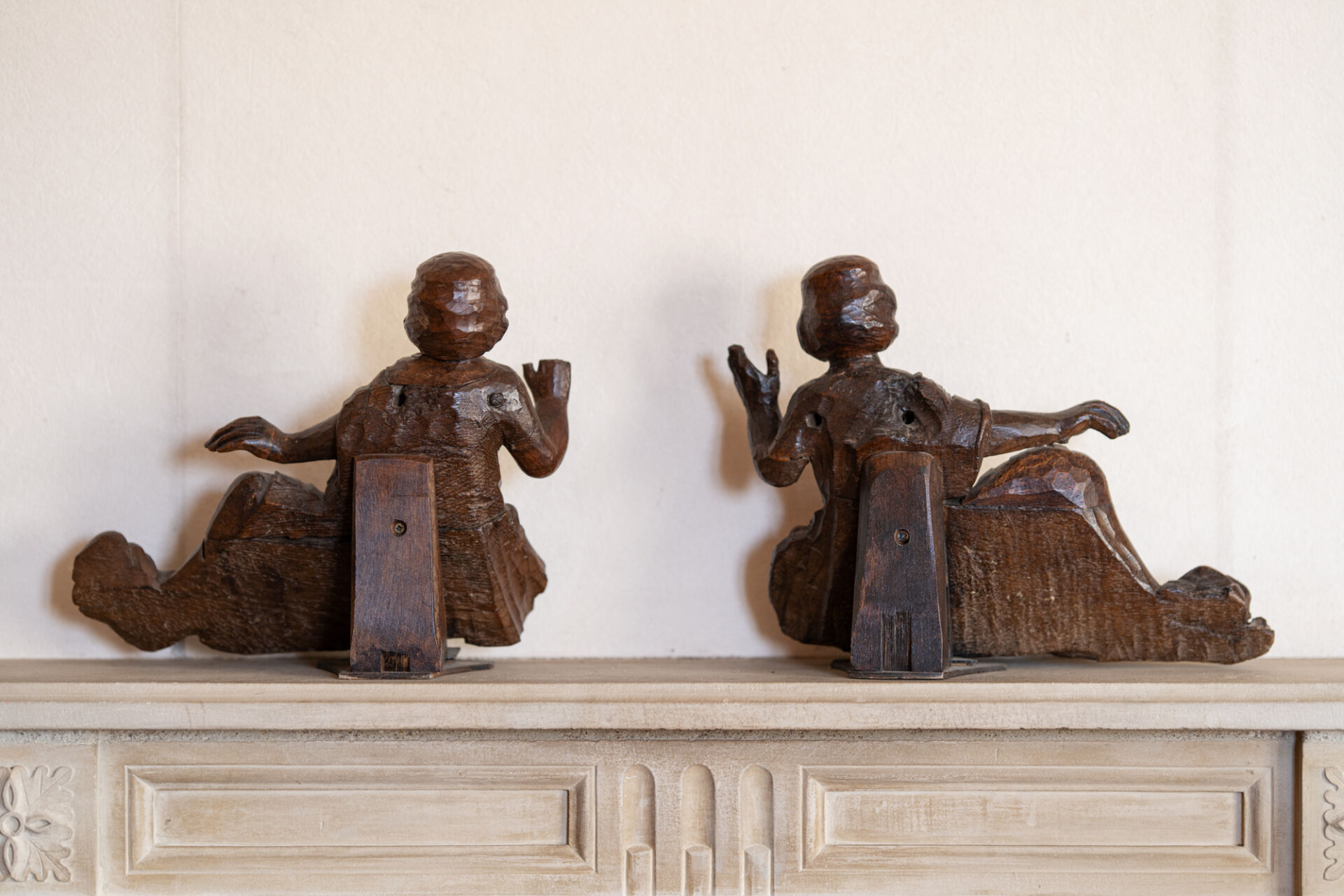Paire d'angelots couchés en chêne sculpté. Sujet sculpté en bois. Restaurations. H : 29 cm ; L : 33 cm ; l : 16 cm