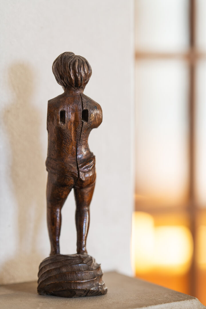 "Angelot". Sujet sculpté en bois. Manques et restaurations. H : 27 cm ; L : 7,5 cm ; l : 6,5 cm