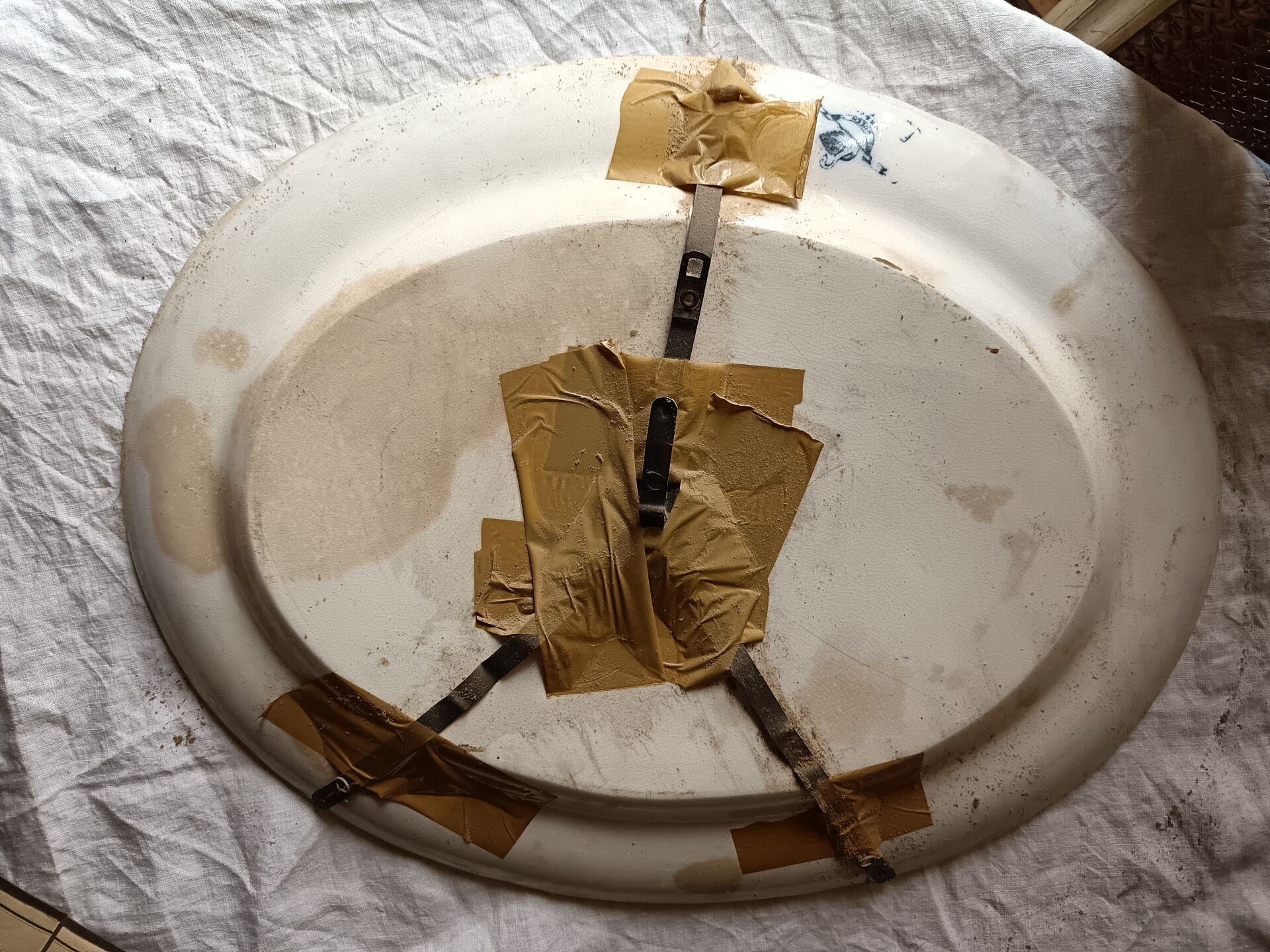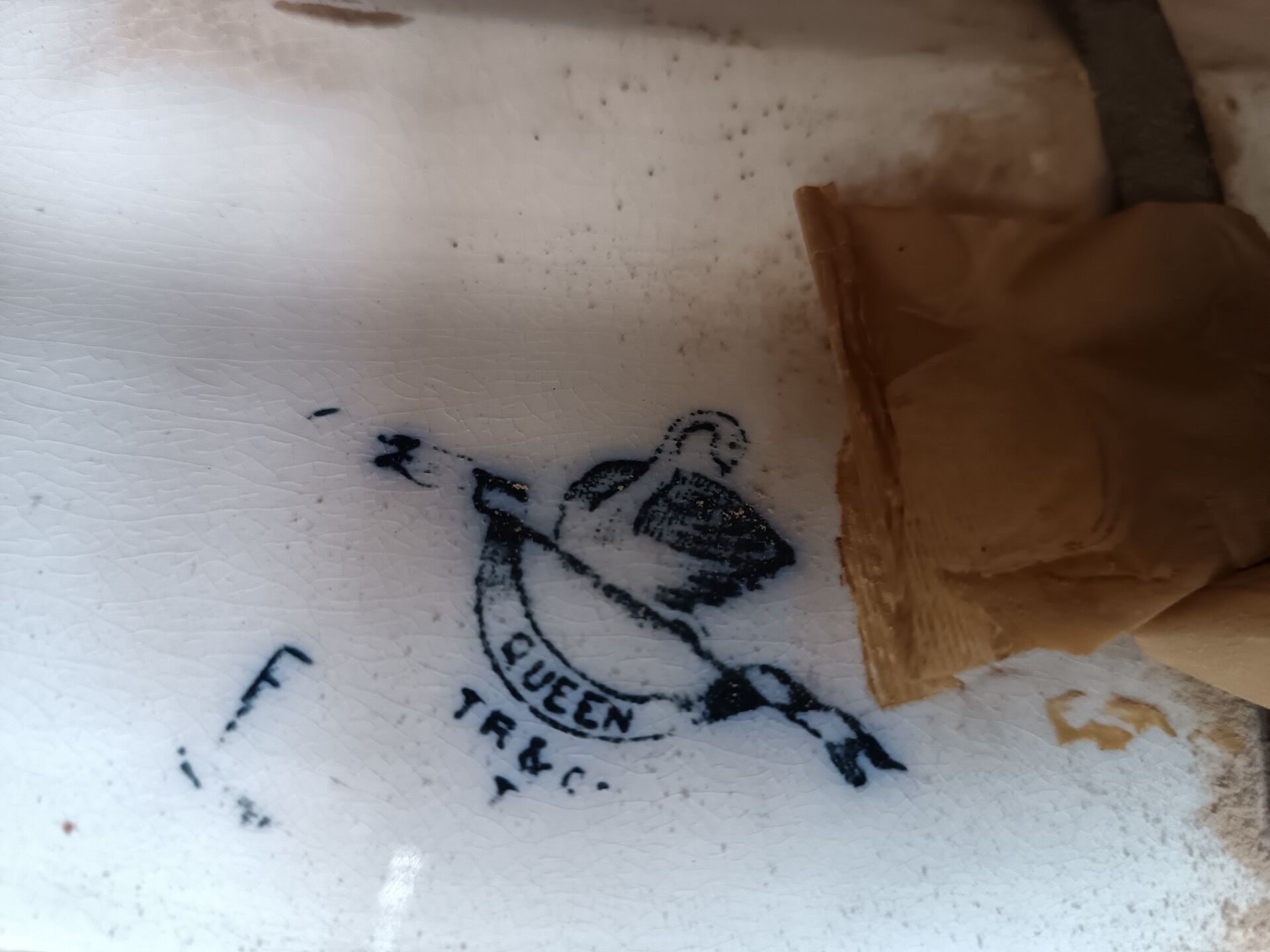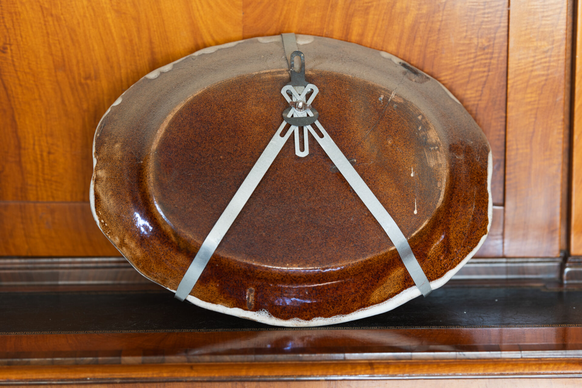 T. Rathbone & Co. Plat en faïence émaillée blanche et bleue. Marqué sous la base. On y joint un plat en faïence à décor floral. Accidents. H : 37 cm ; L : 47 cm ; l : 2 cm. H : 26 cm ; L : 34 cm ; l : 3 cm.