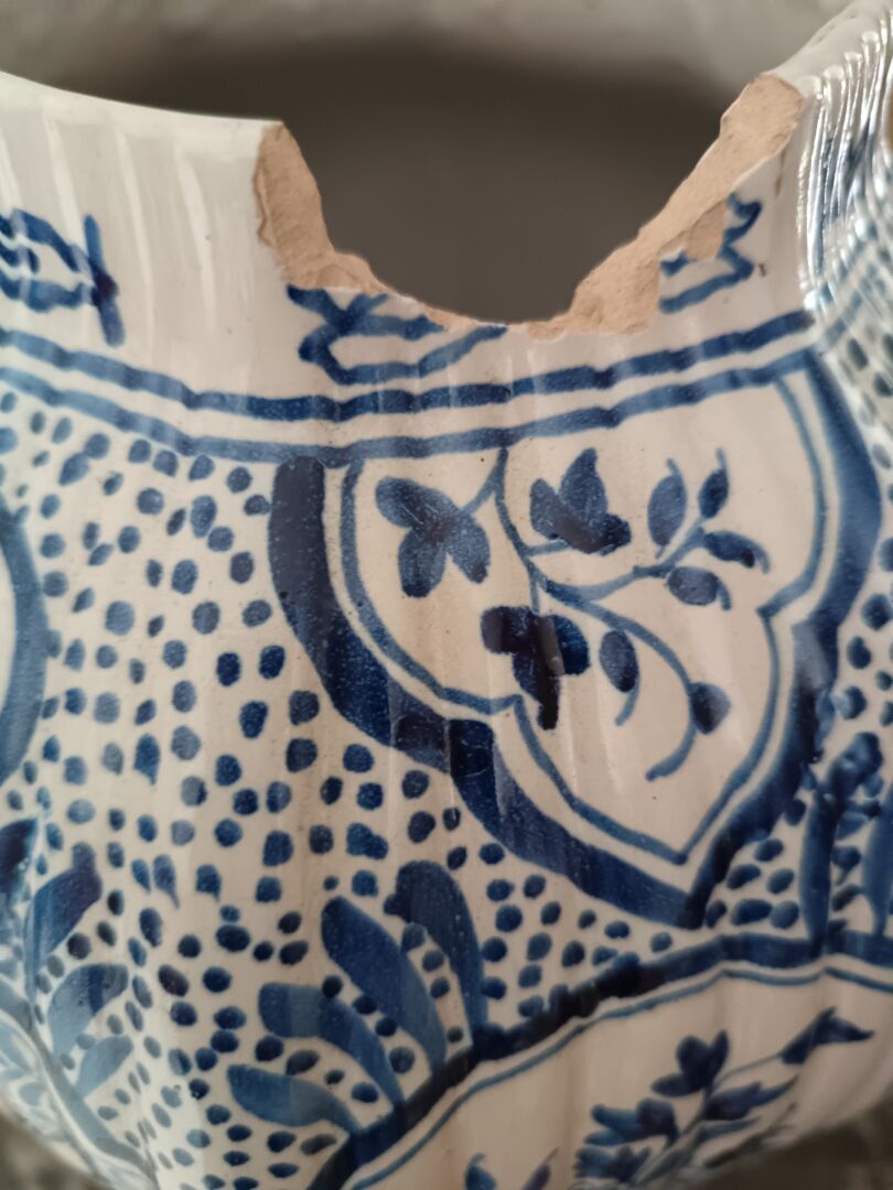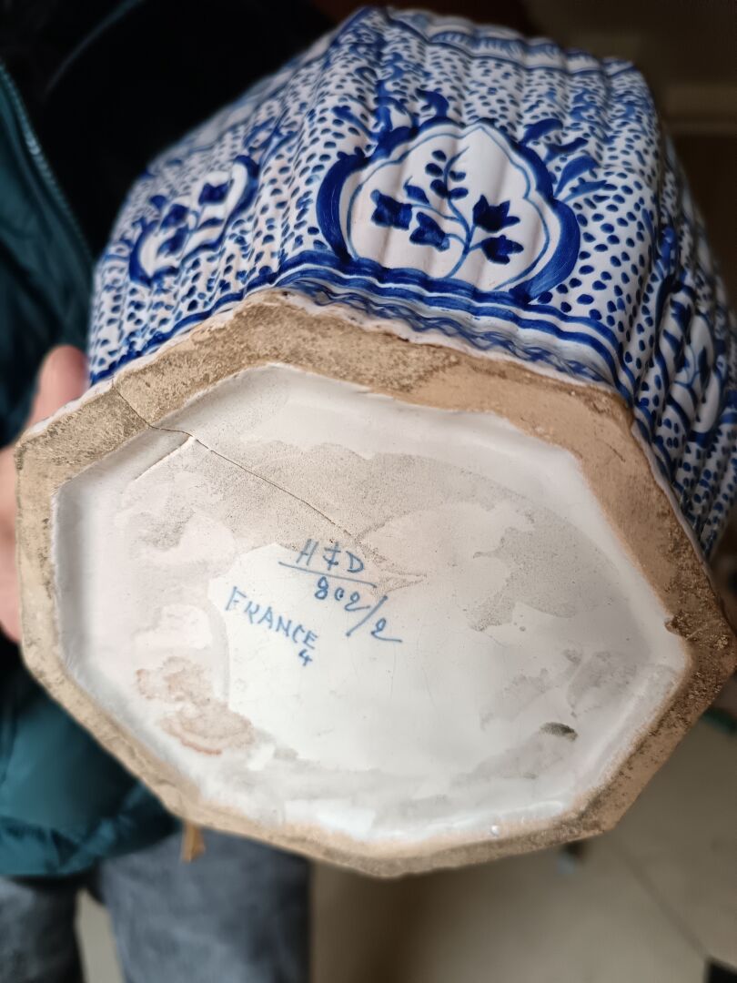 Pot couvert en faïence émaillée bleue et blanche. Marqué sous la base. Accidents. H : 45 cm ; D : 24 cm