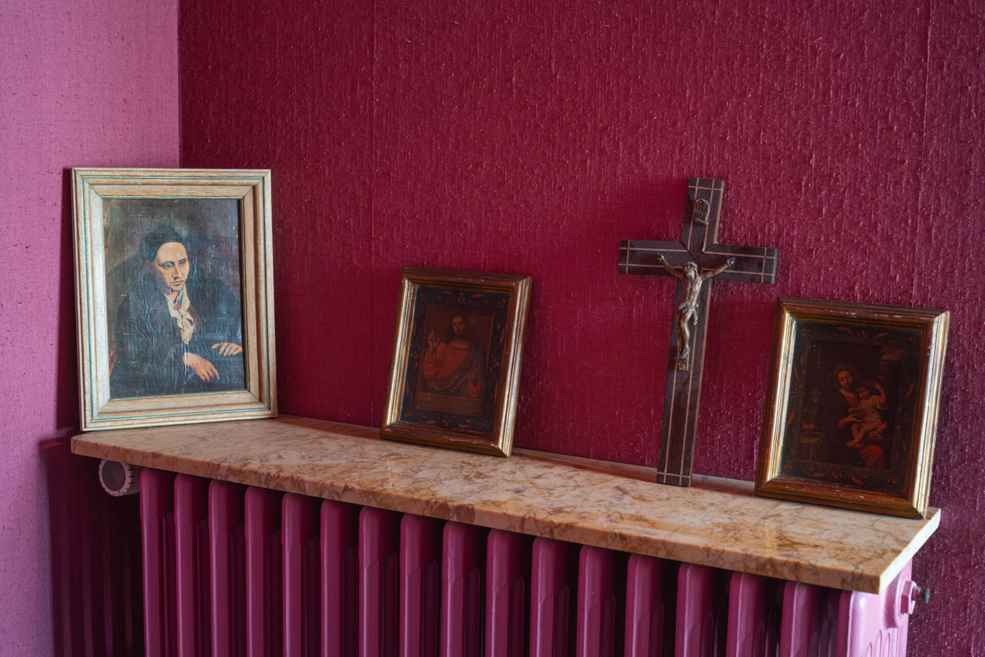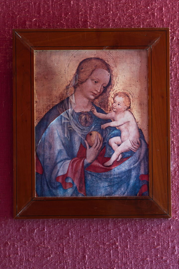Lot comprenant quatre pièces encadrées (reproductions) et un crucifix. Dimension max : 31 x 24 cm