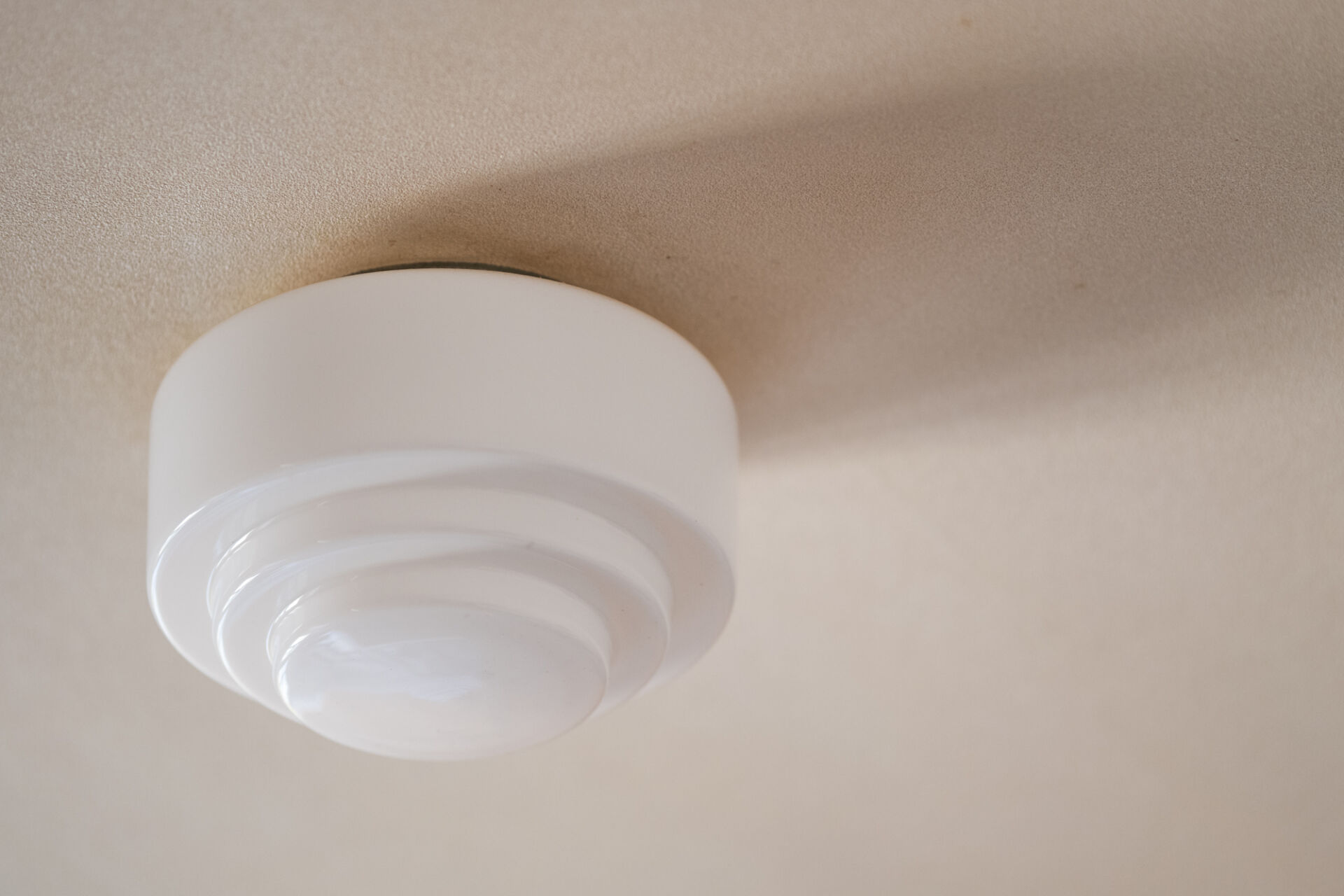 Plafonnier moderne en verre opalin blanc. H : 16 cm ; D : 24 cm