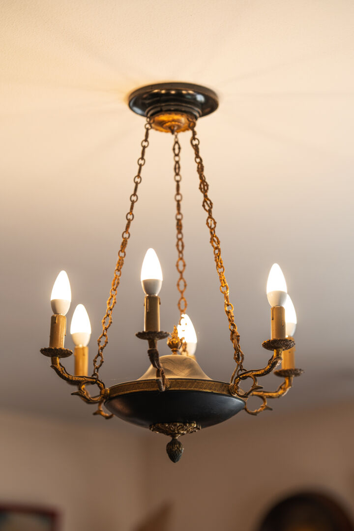 Lustre à six bras de lumière en bronze. Style Empire. H : 60 cm ; D : 50 cm