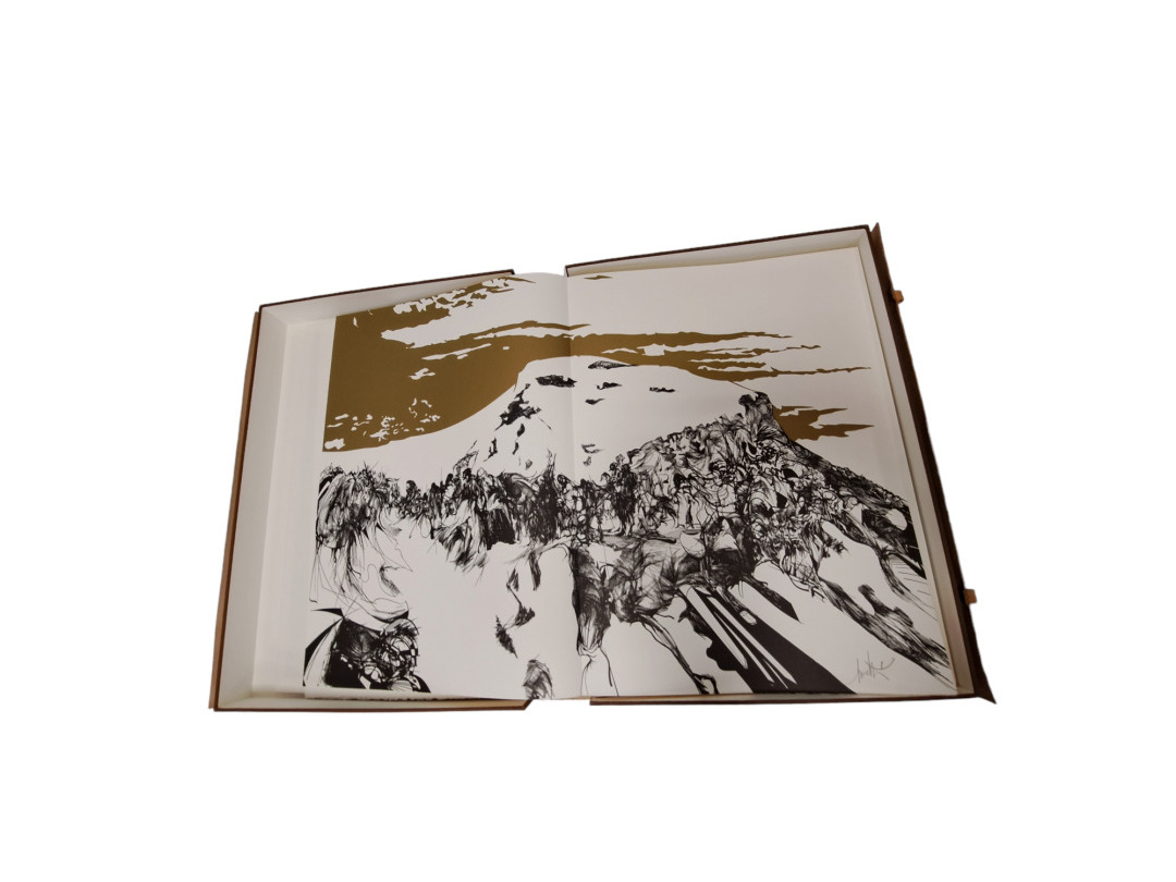 Moshé DAYAN Massada Paris, Georges Israël, 1982, In-folio, en feuilles sous chemise et emboîtage de l'éditeur gainé de cuir estampé, tige en bois pour la fermeture. Illustré de 16 lithographies signées au crayon par Raymond Moretti. Numéroté 6 et signé par l'éditeur, l'artiste, l'auteur et le préfacier (Uzi Narkiss).