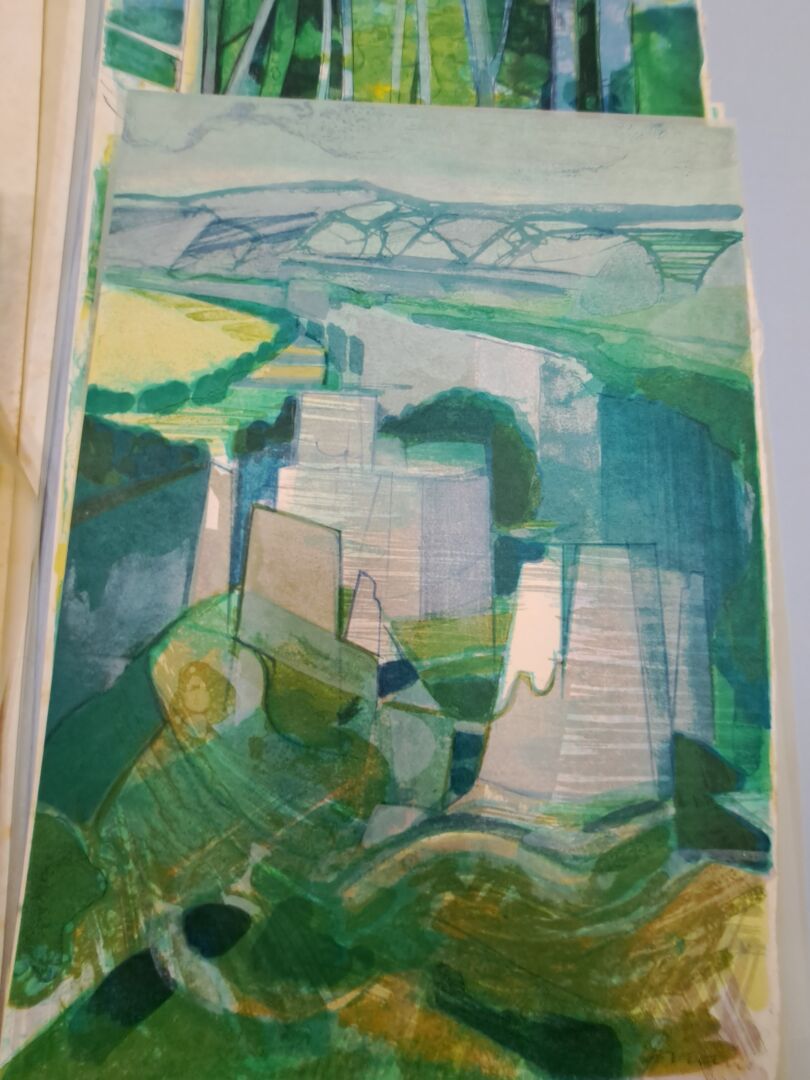 Camille HILAIRE (1916-2004) et Pierre Gascar La Normandie Paris, Robert Mouret et Papelier 1976, in-folio, en feuillets sur Japon nacré sous emboitage toilé vert de l'éditeur et chemise assortie jointe contenant 15 lithographies sur Japon nacré en deux tailles (73.5x53 et 53 x 37) numérotées et signées par l'artiste et une seconde chemise assortie contenant 15 lithographies sur vélin d'arches. Illustré par des litohgraphies de Camille Hilaire sur velin d'Arches. Porte un envoi de l'artiste. Numéroté XLI. Mouillures