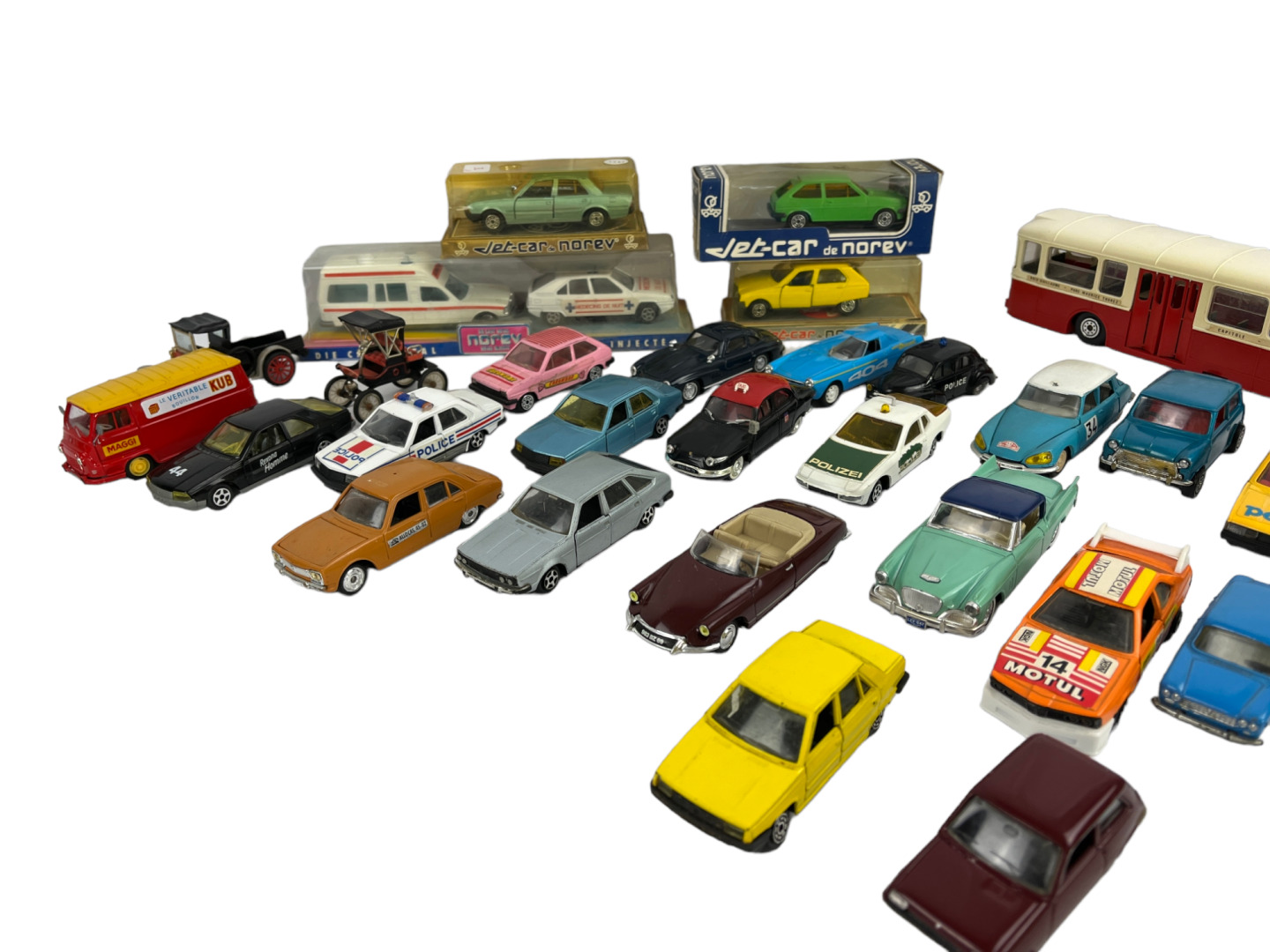 NOREV (anciens et contemporains), MINIALUX, 1/43 ème Lot de trente véhicules tout type dont quatre en boîte (Ford Fiesta n°873, Citroen Visa, Peugeot 505 n°889 et ensemble de deux ambulances ref. 1500) Bon état à très bon état