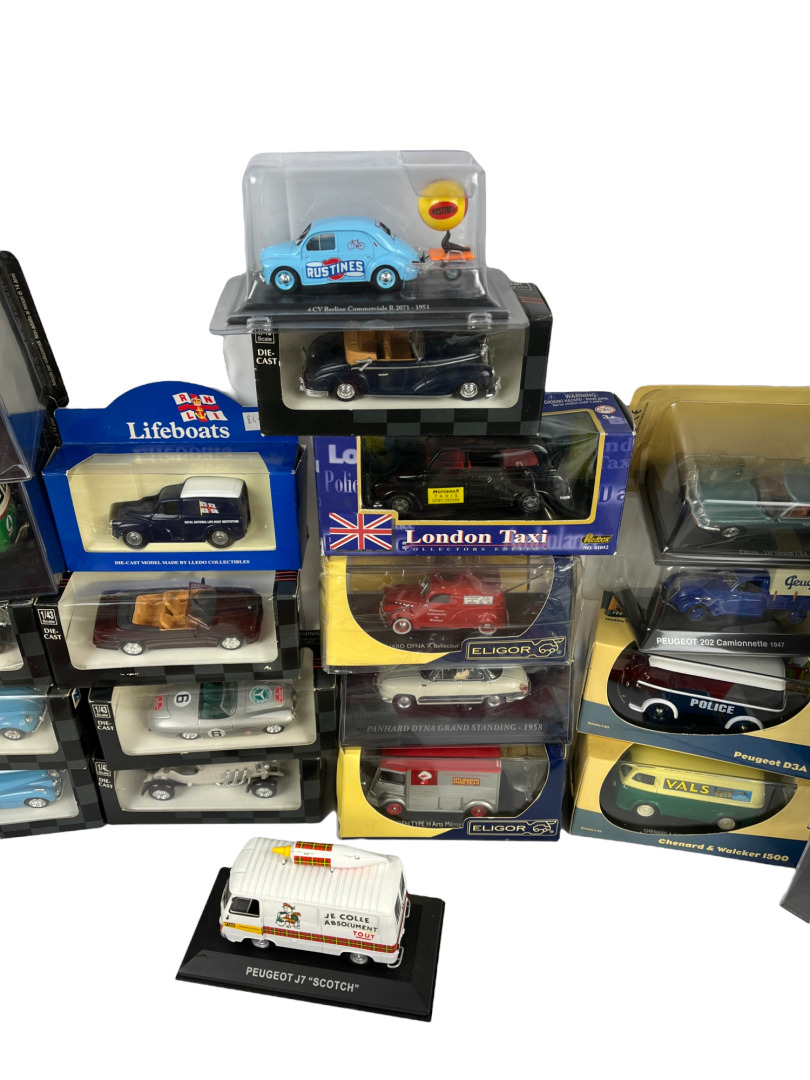 ELIGOR, HACHETTE, NEWRAY et divers, 1/43 ème Lot de quarante sept véhicules tout type, état neuf en boîte. On y joint trois véhicules sans boîte